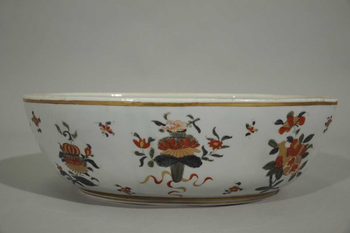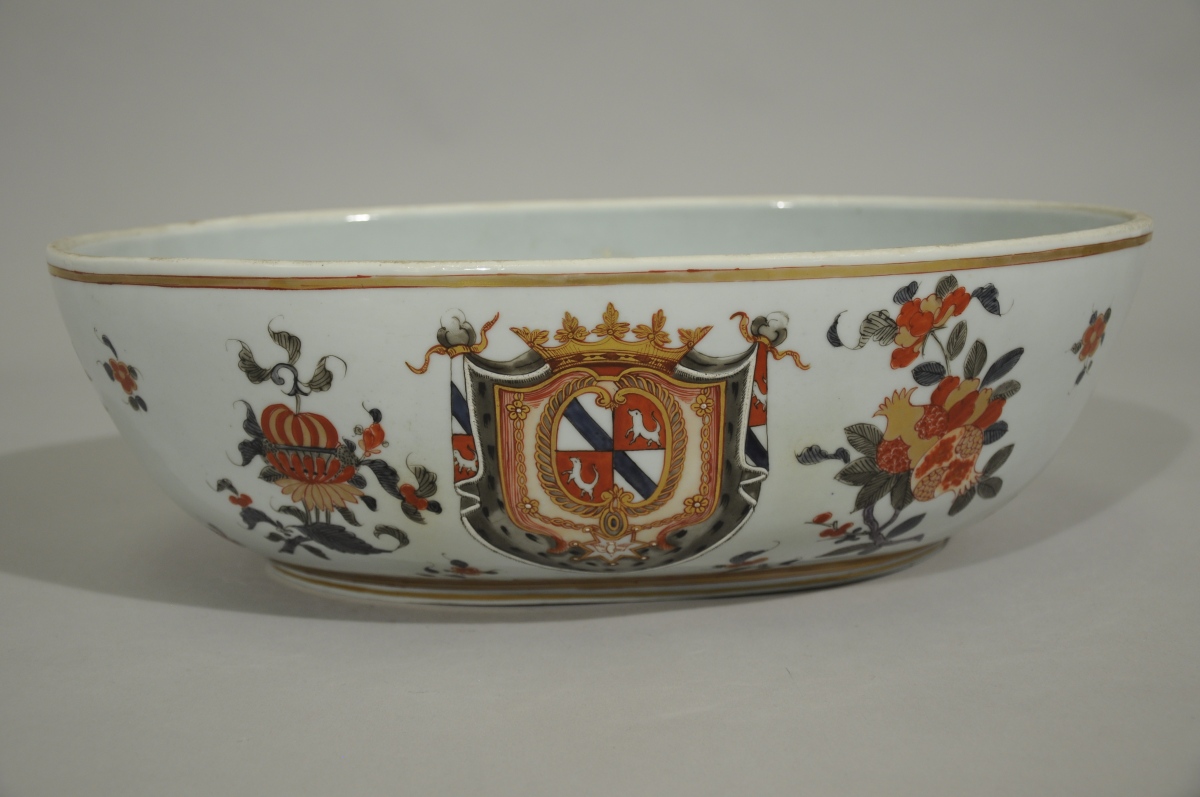 SAXE (?). Grande VASQUE de forme ovale en porcelaine décorée en émaux polychromes et or d'armoiries et bouquets fleuris de pivoines et grenades, le bord décoré de frise de fers de lance.