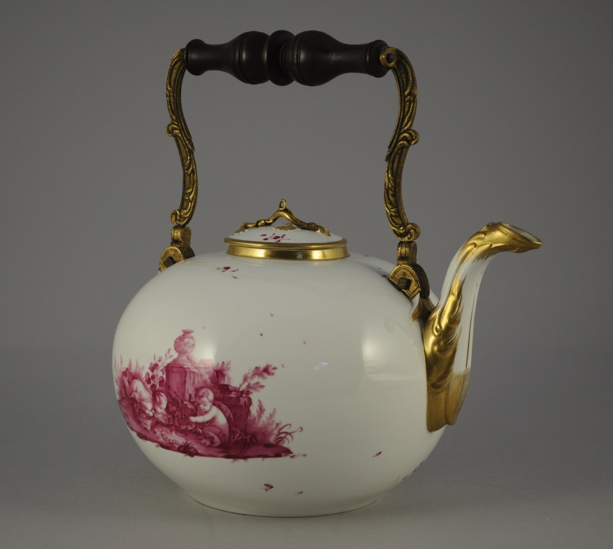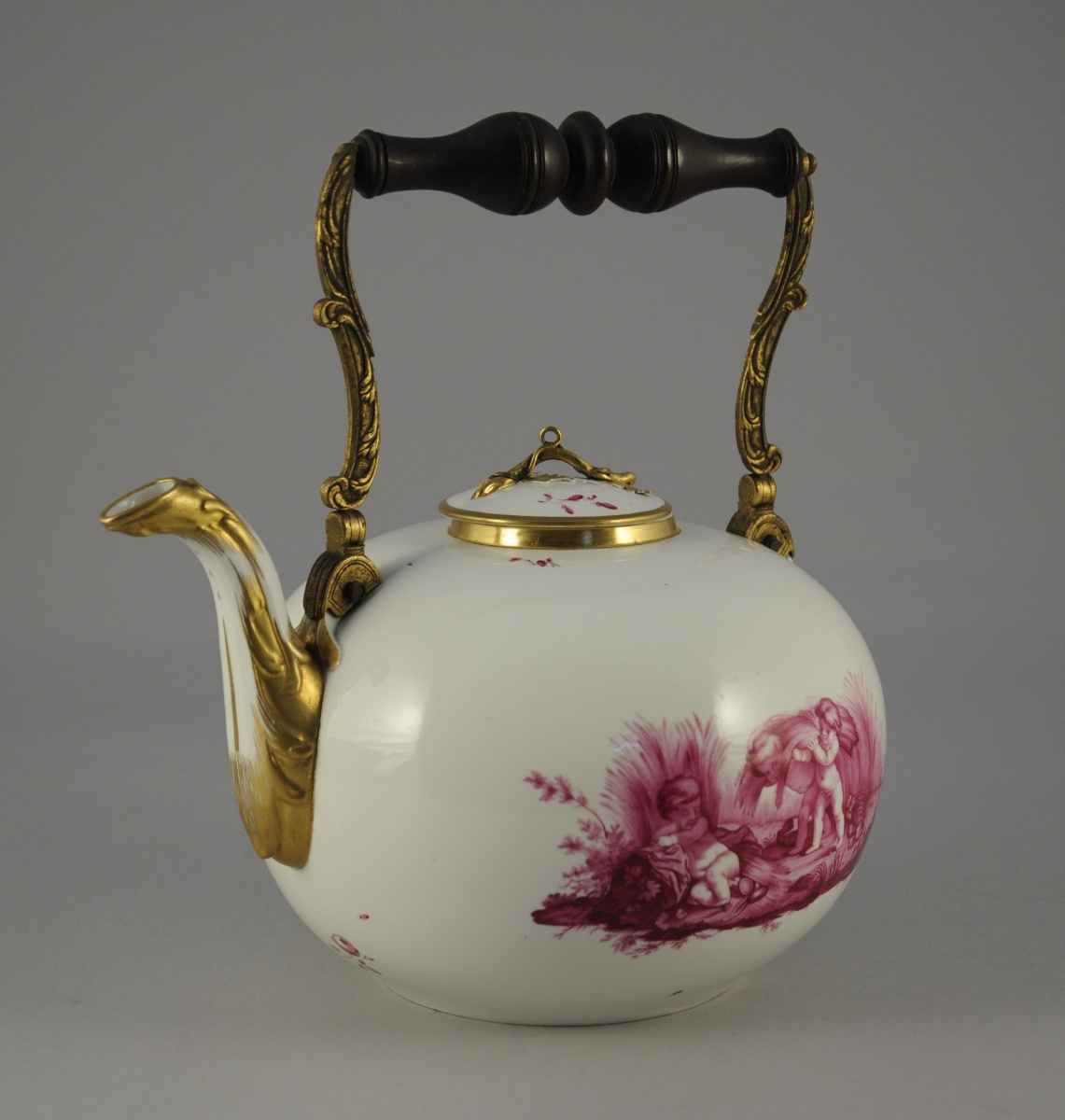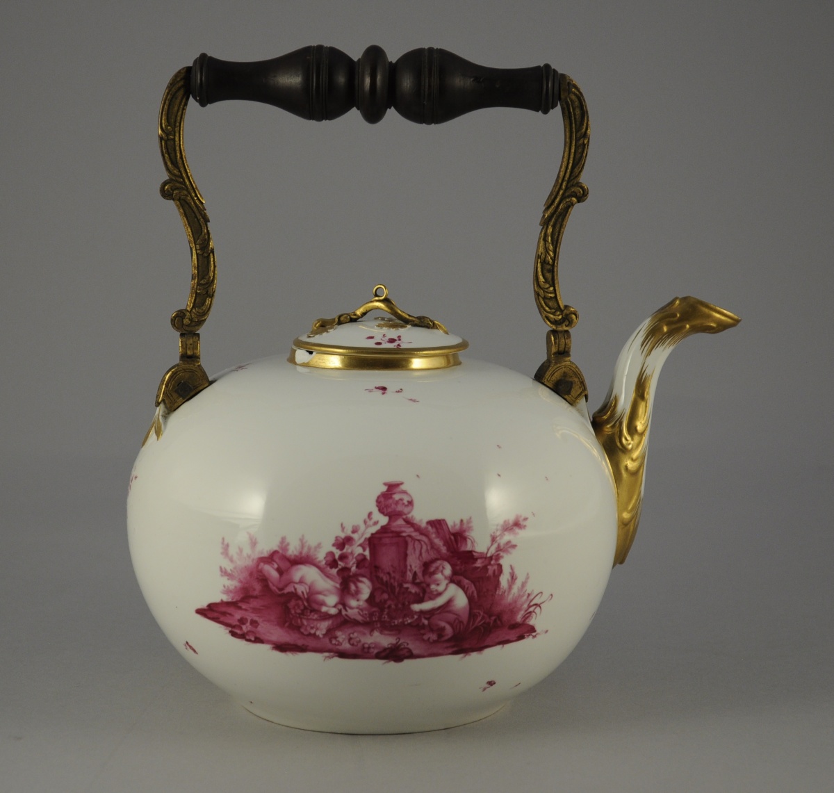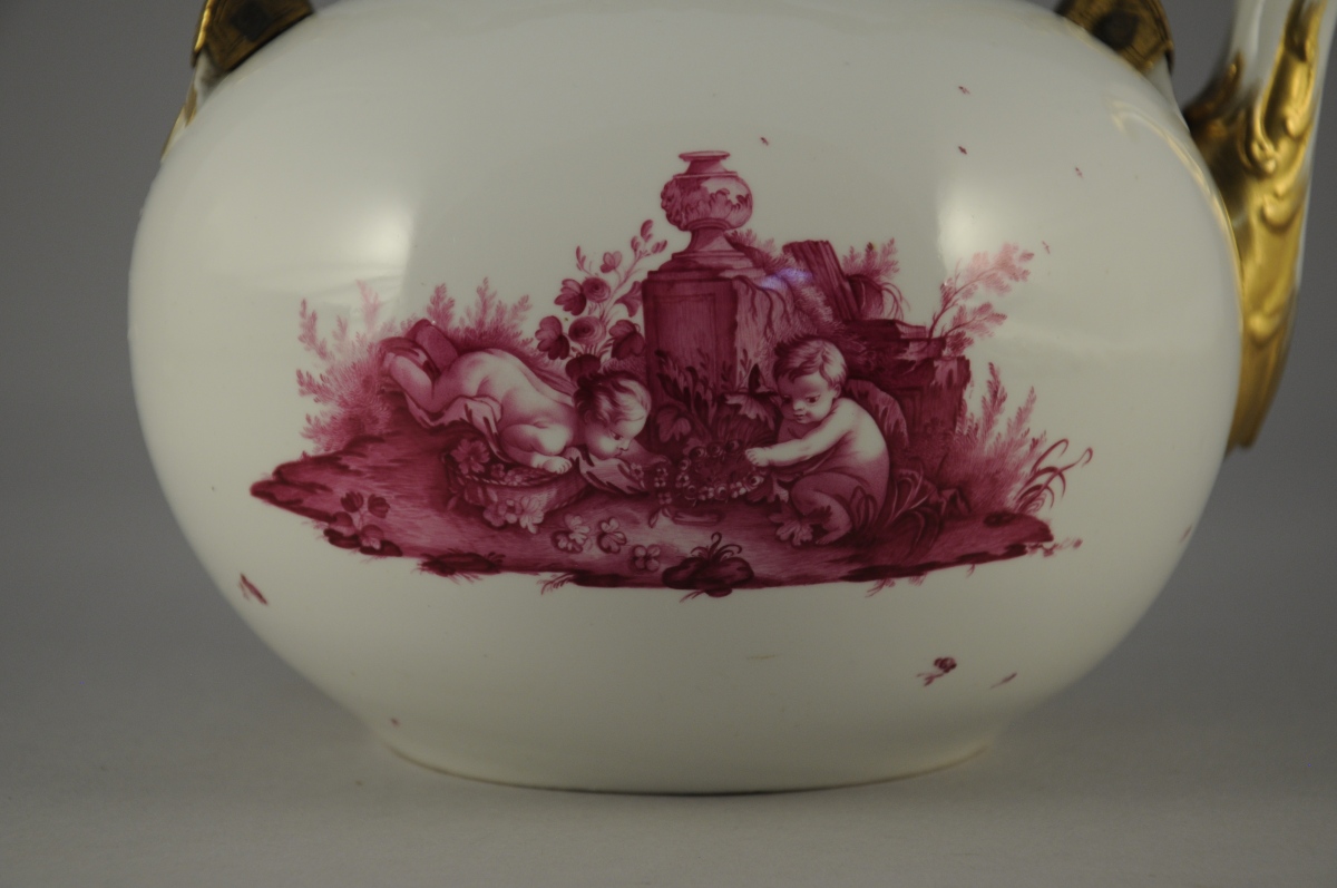HOECHST. THÉIÈRE globulaire en porcelaine à décor en camaïeu pourpre de putti moissonneurs sur une face, et tressant une couronne de fleurs dans des ruines sur l'autre, et semis de fleurettes. Le déversoir rocaille est orné de feuilles d'acanthe en relief. Rehauts de dorure. La prise du couvercle en forme de branchage feuillagé en dorure. Marque au fond extérieur : roue couronnée en bleu.