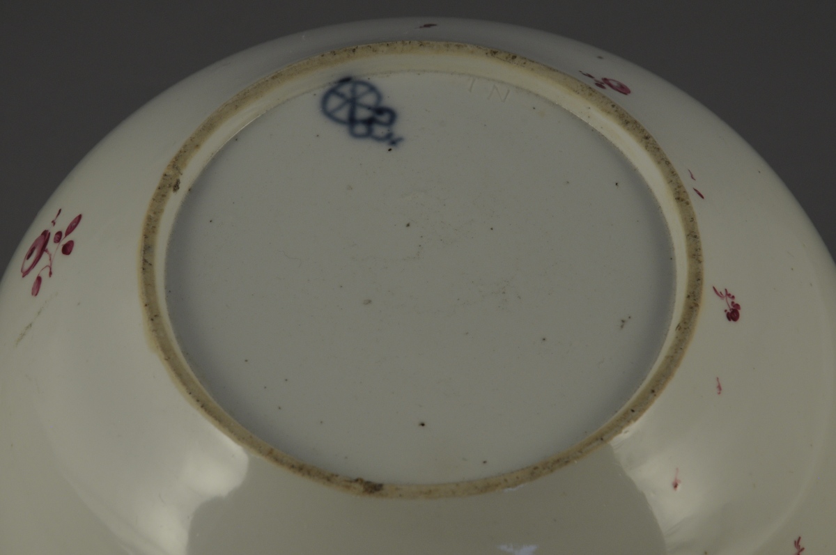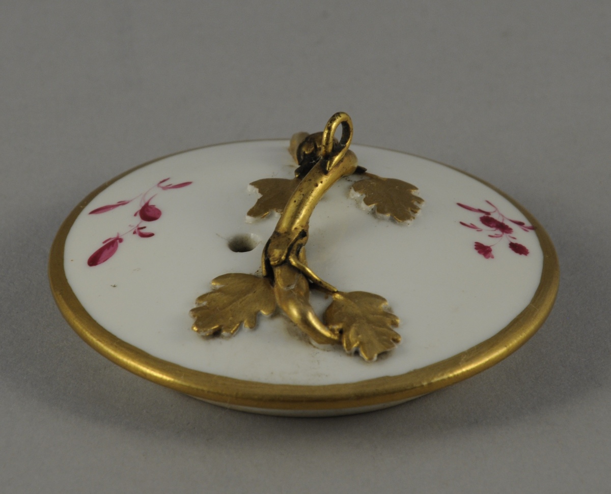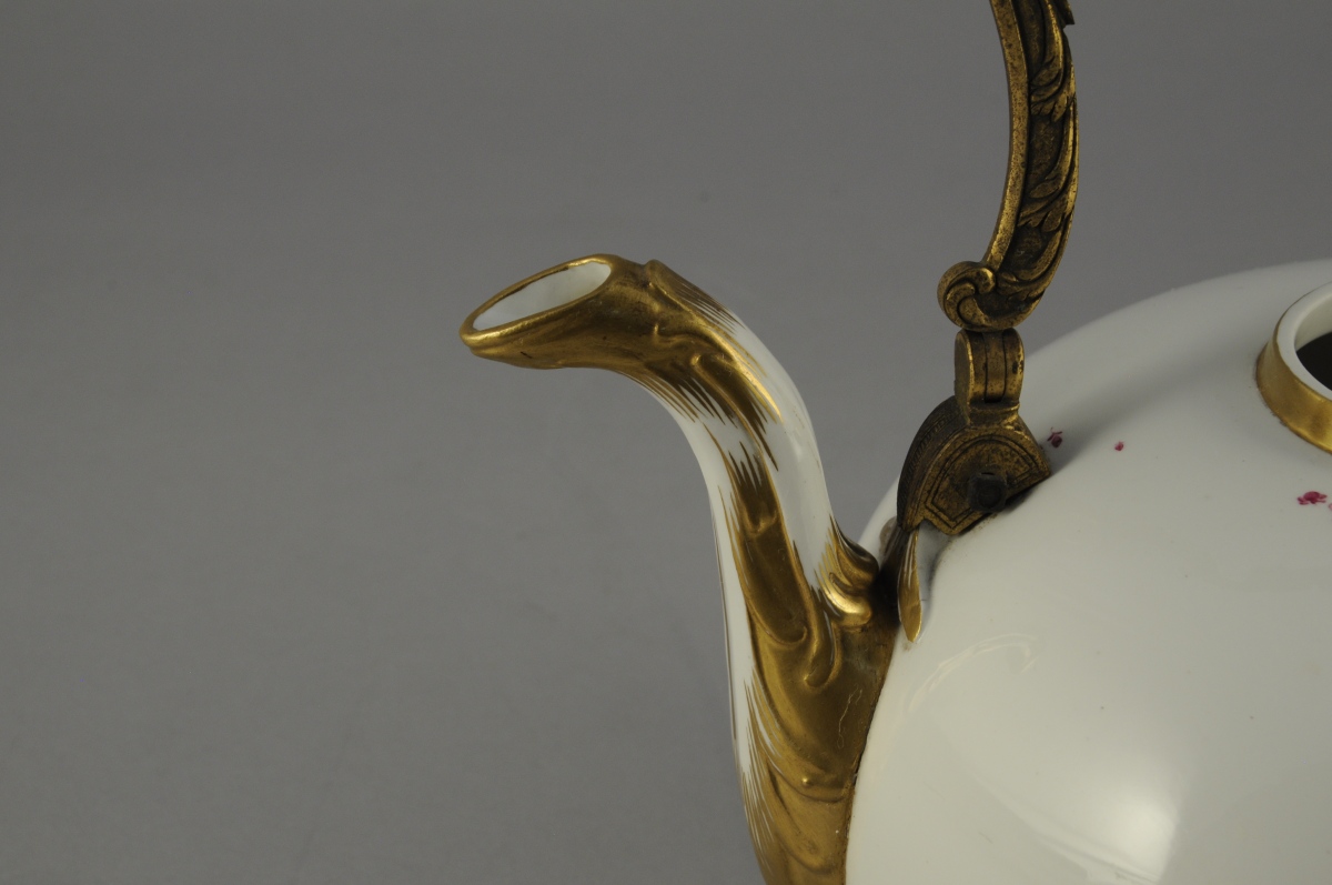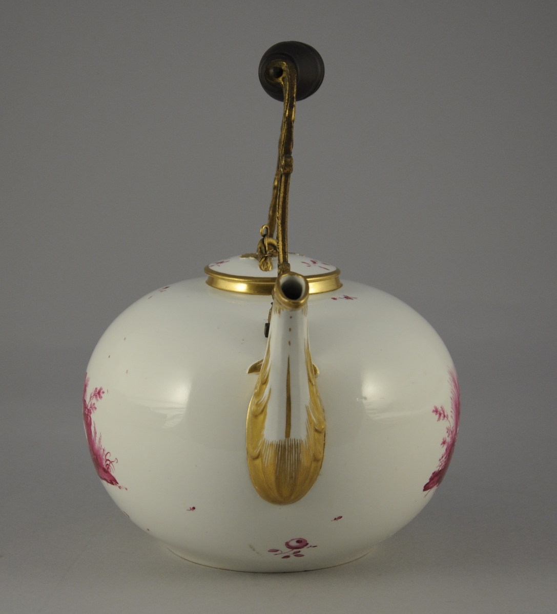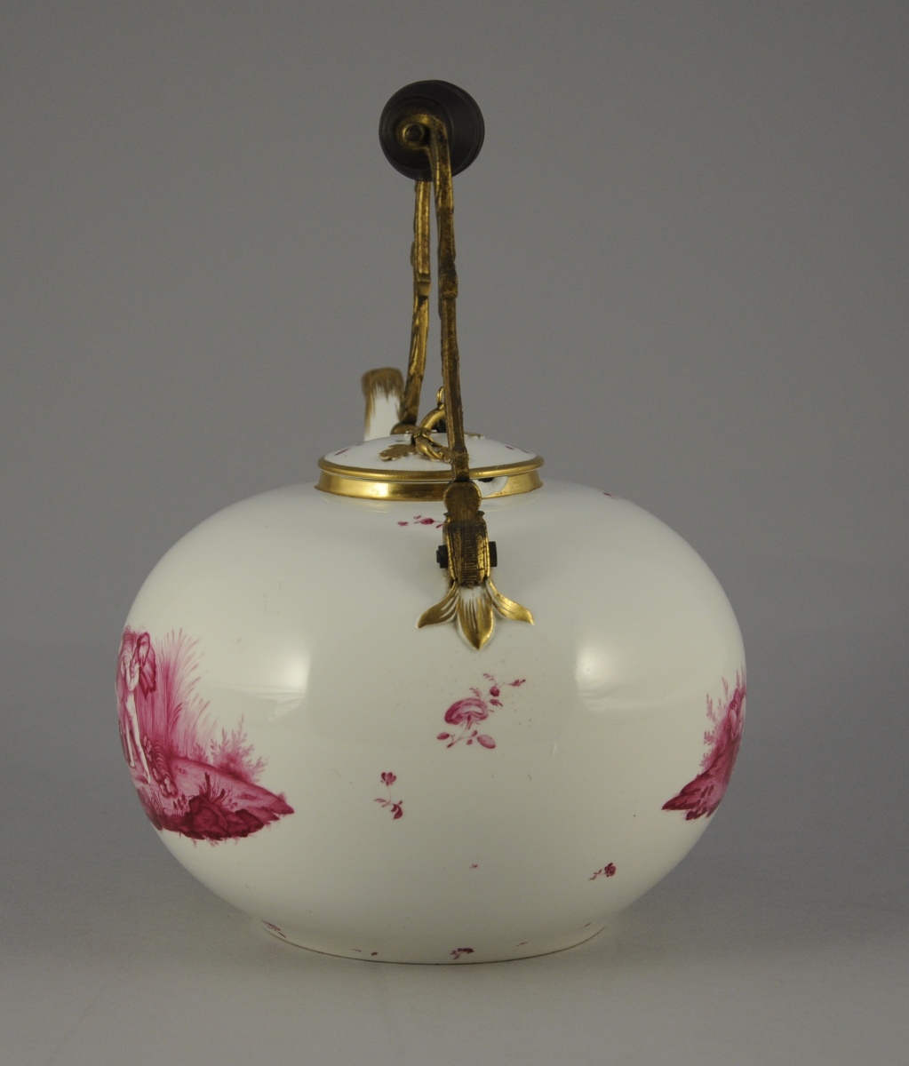 HOECHST. THÉIÈRE globulaire en porcelaine à décor en camaïeu pourpre de putti moissonneurs sur une face, et tressant une couronne de fleurs dans des ruines sur l'autre, et semis de fleurettes. Le déversoir rocaille est orné de feuilles d'acanthe en relief. Rehauts de dorure. La prise du couvercle en forme de branchage feuillagé en dorure. Marque au fond extérieur : roue couronnée en bleu.