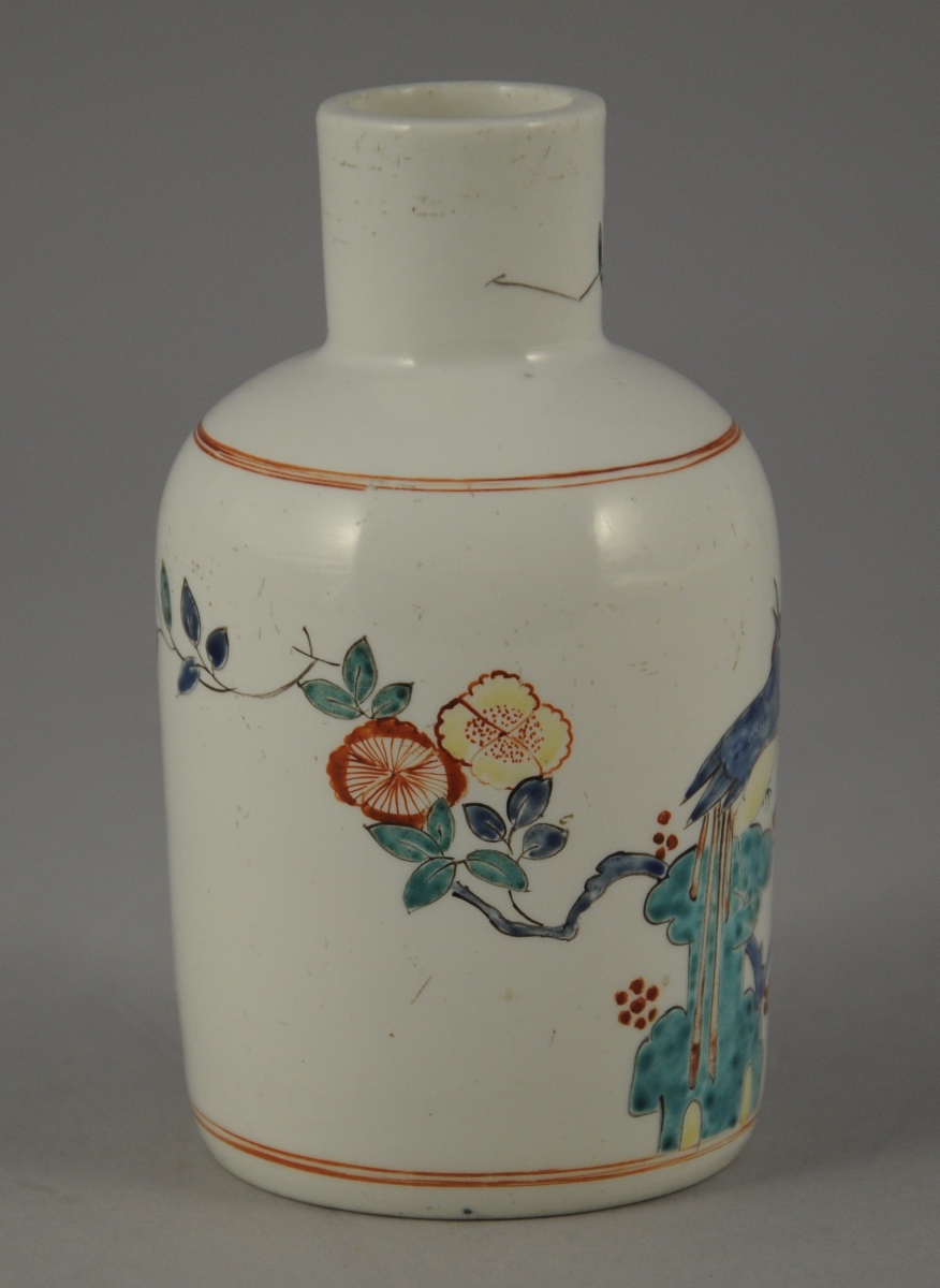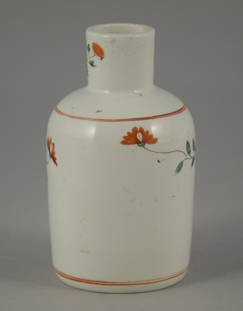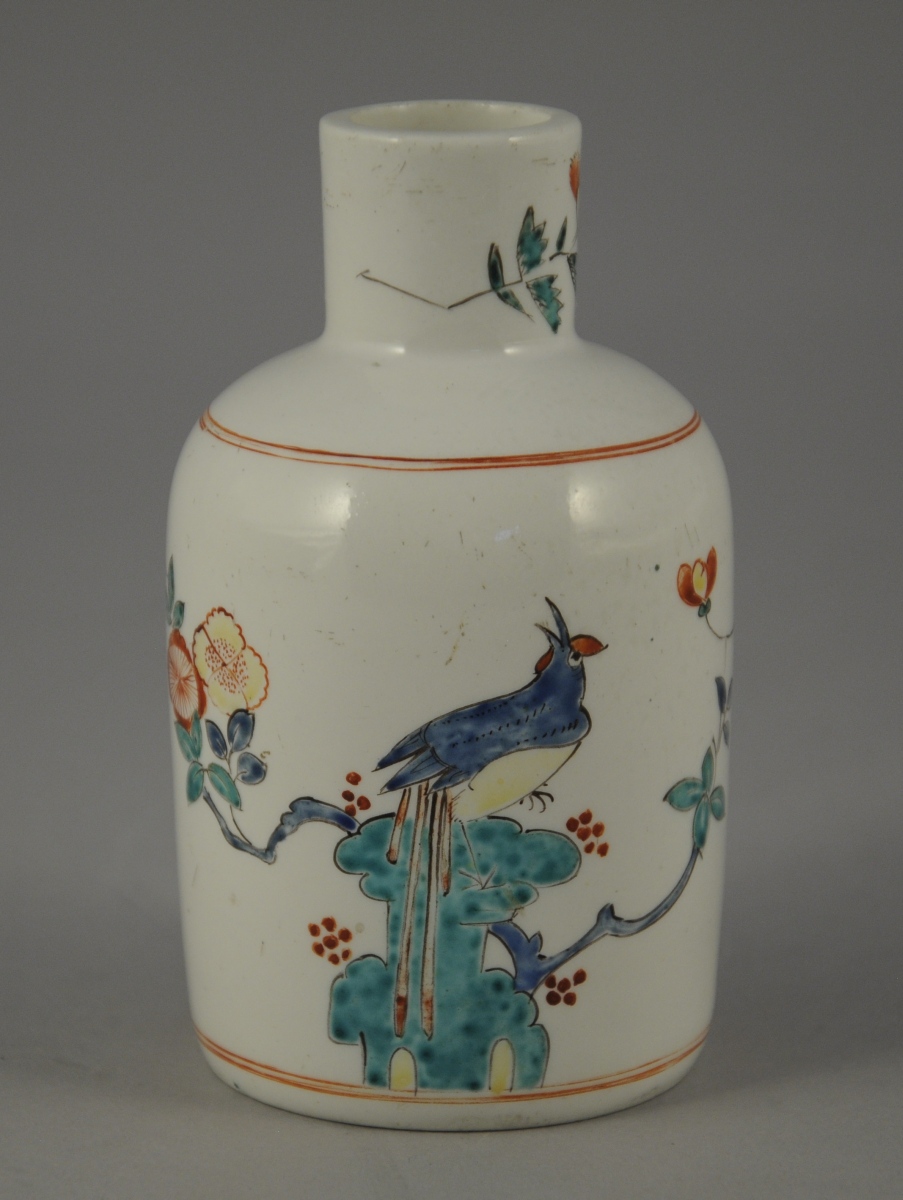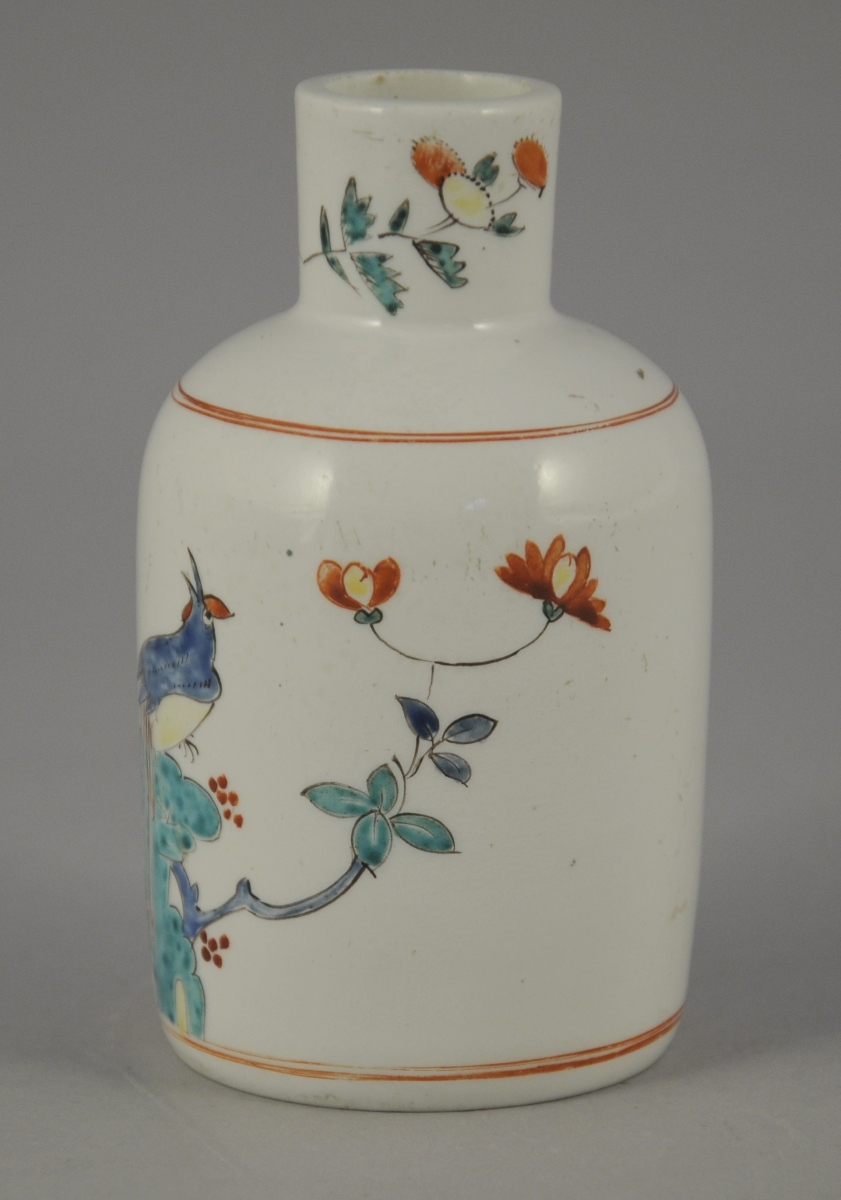 CHANTILLY. Petit FLACON en porcelaine tendre à décor Kakiemon d'un oiseau perché sur un rocher et de branchages fleuris. Double filet en rouge de fer à l'épaulement et à la base. Marque « au cor de chasse » en rouge de fer.