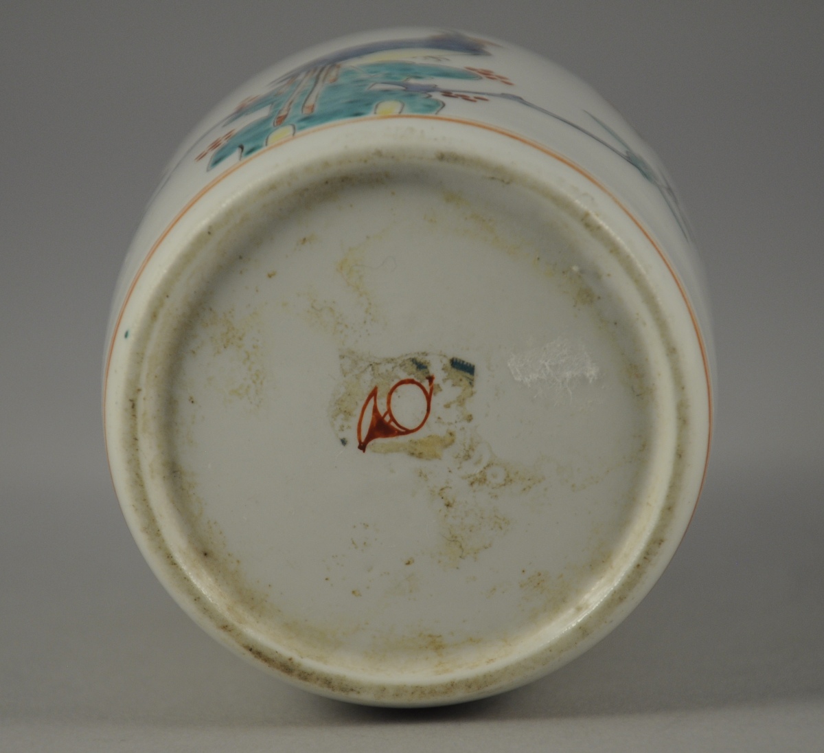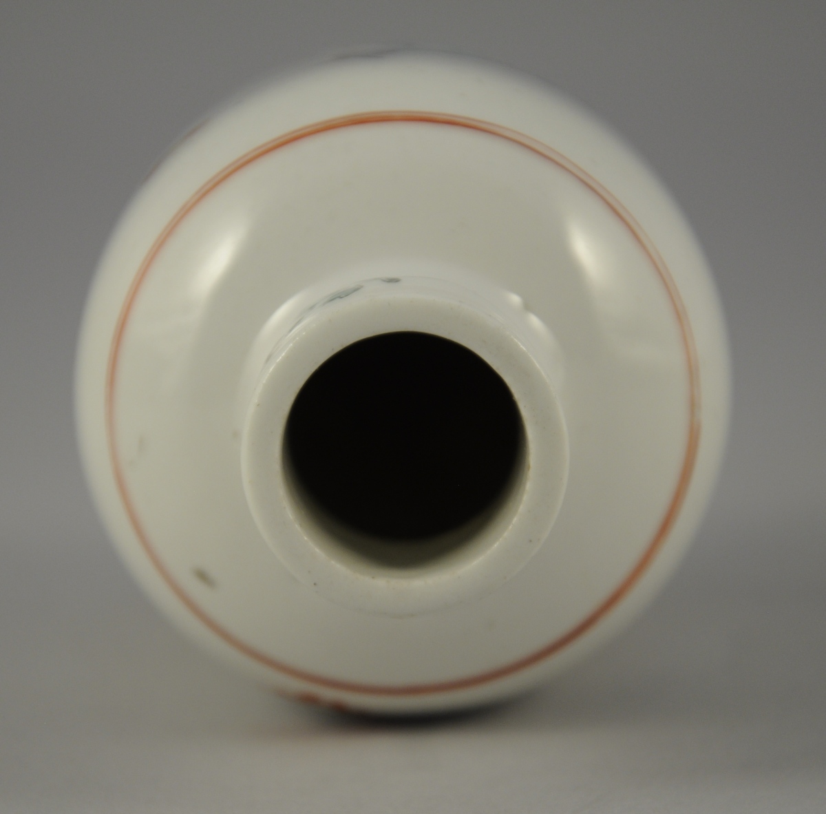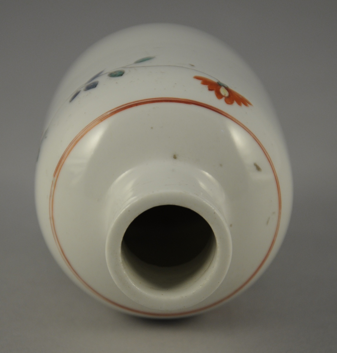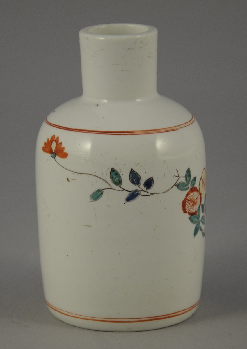CHANTILLY. Petit FLACON en porcelaine tendre à décor Kakiemon d'un oiseau perché sur un rocher et de branchages fleuris. Double filet en rouge de fer à l'épaulement et à la base. Marque « au cor de chasse » en rouge de fer.