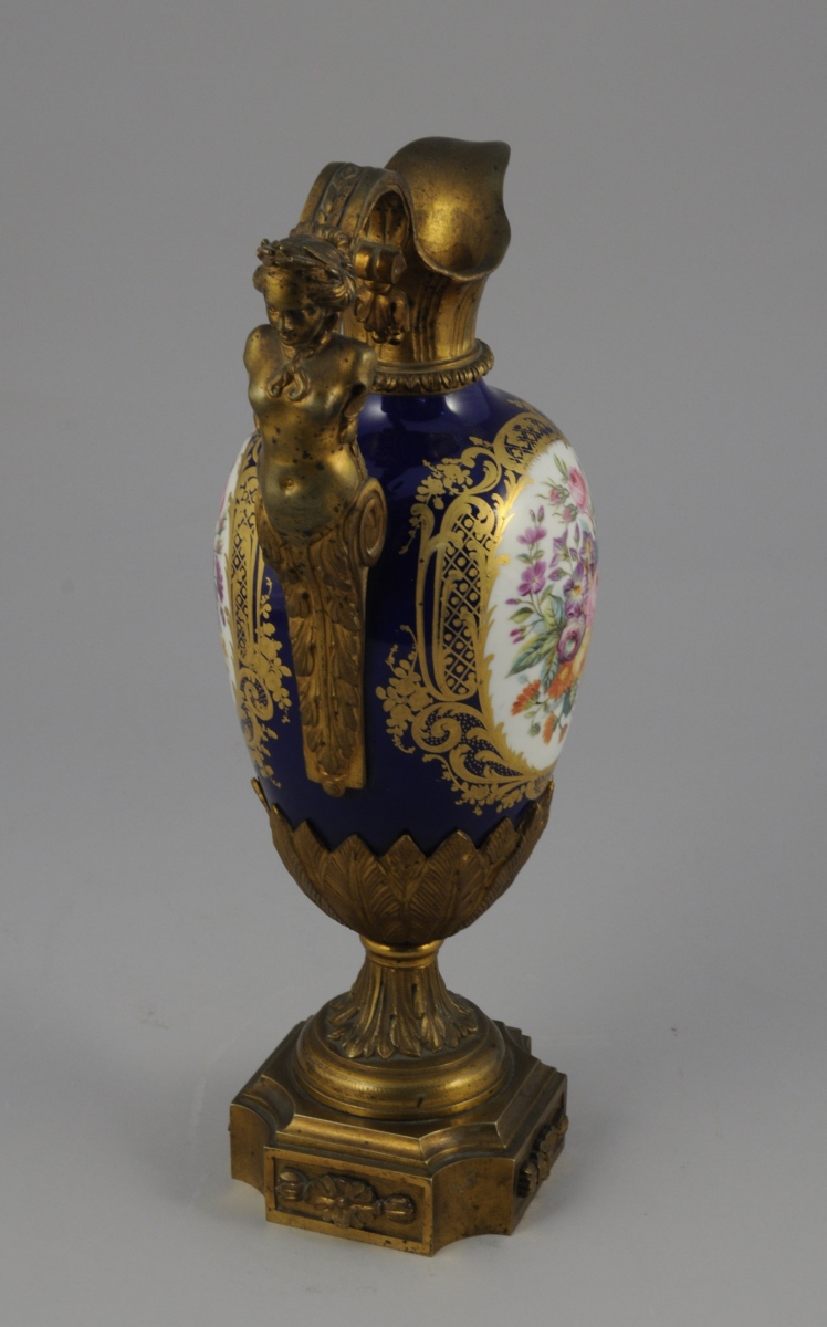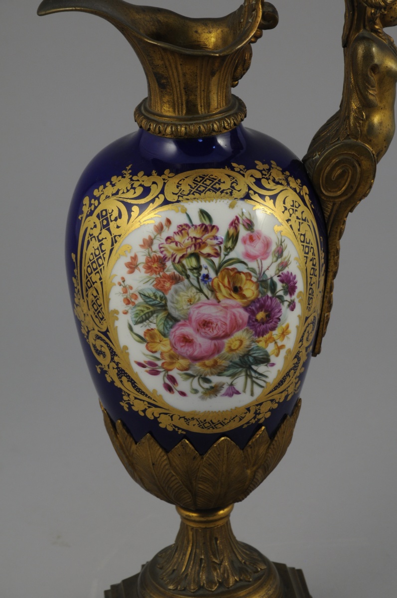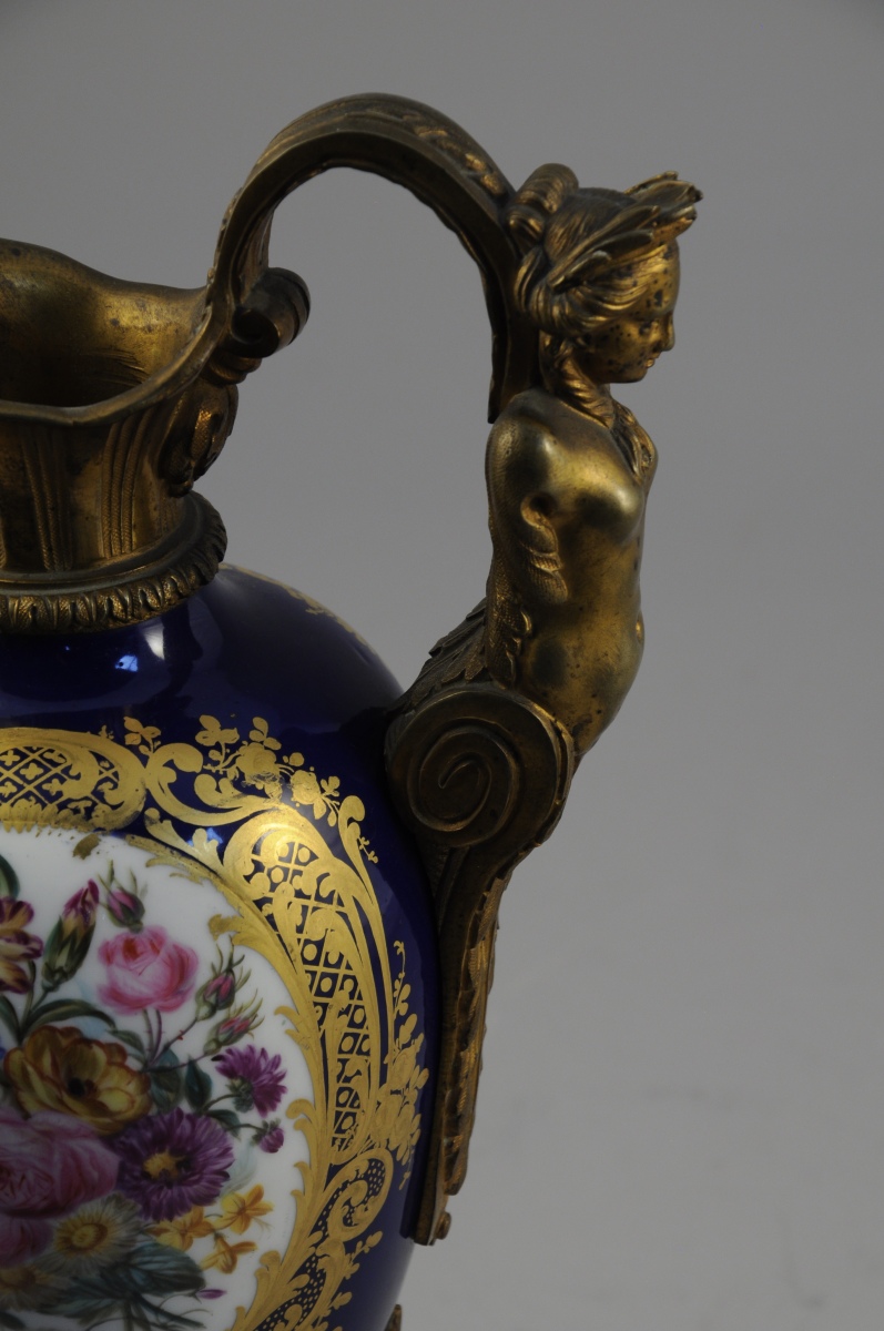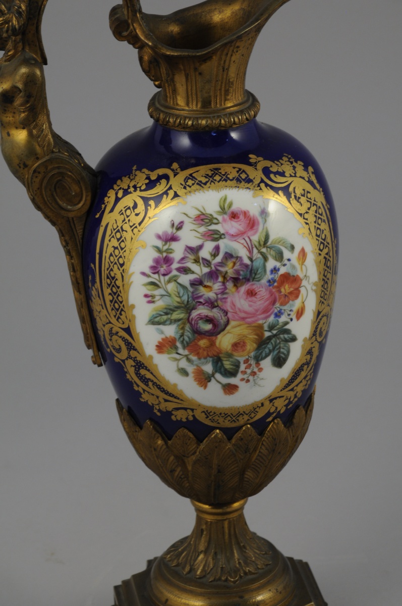 PARIS. AIGUIÈRE décorative. Le corps ovoïde en porcelaine à fond bleu émaillé polychrome de bouquets floraux dans des réserves à encadrement de quadrillages et volutes feuillagées or. Monture en bronze ciselé et doré d'une cariatide pour l'anse et de feuillages lancéolés sur le piédouche. Base de forme carrée à coins convexes agrémentée de fleurons.