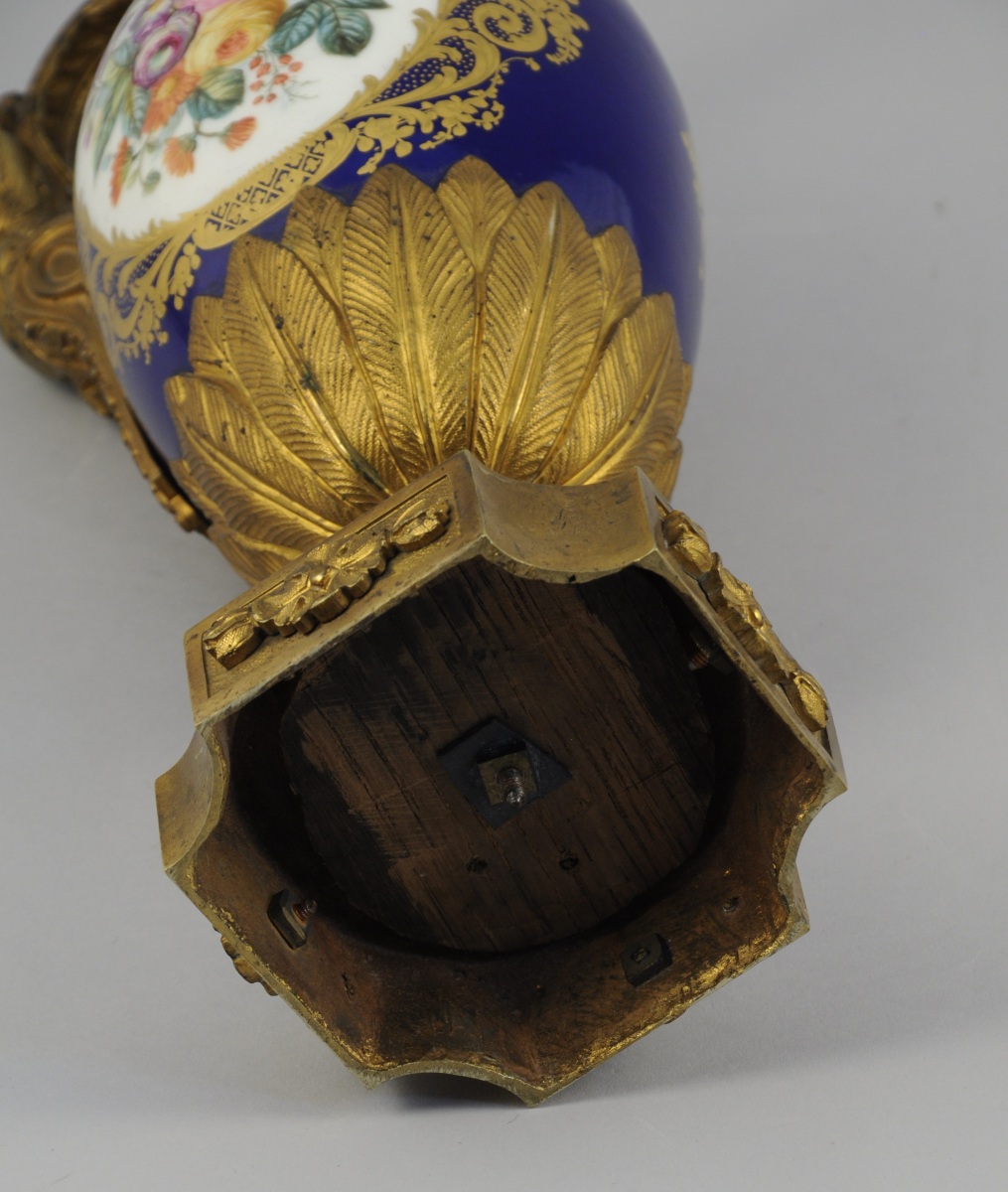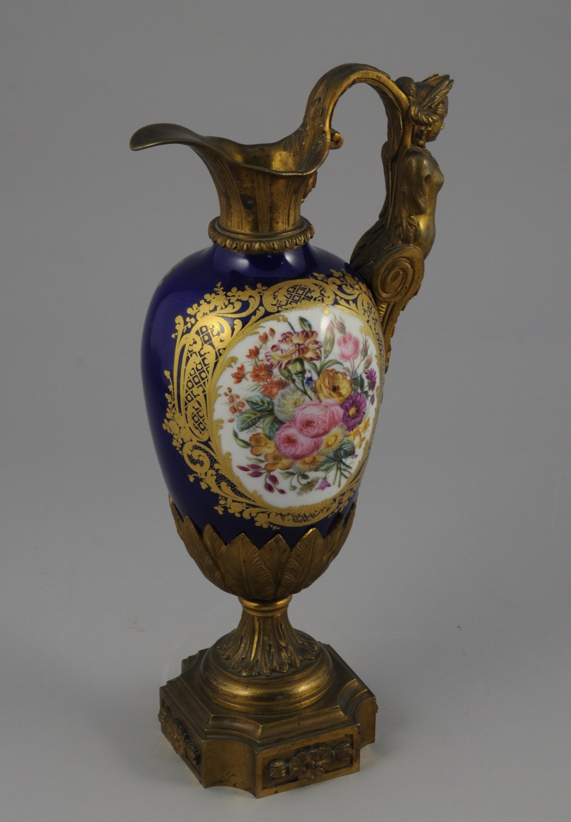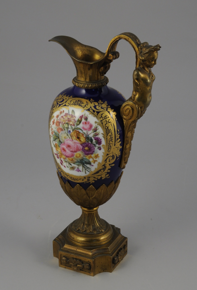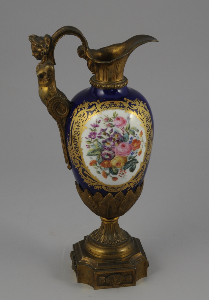 PARIS. AIGUIÈRE décorative. Le corps ovoïde en porcelaine à fond bleu émaillé polychrome de bouquets floraux dans des réserves à encadrement de quadrillages et volutes feuillagées or. Monture en bronze ciselé et doré d'une cariatide pour l'anse et de feuillages lancéolés sur le piédouche. Base de forme carrée à coins convexes agrémentée de fleurons.