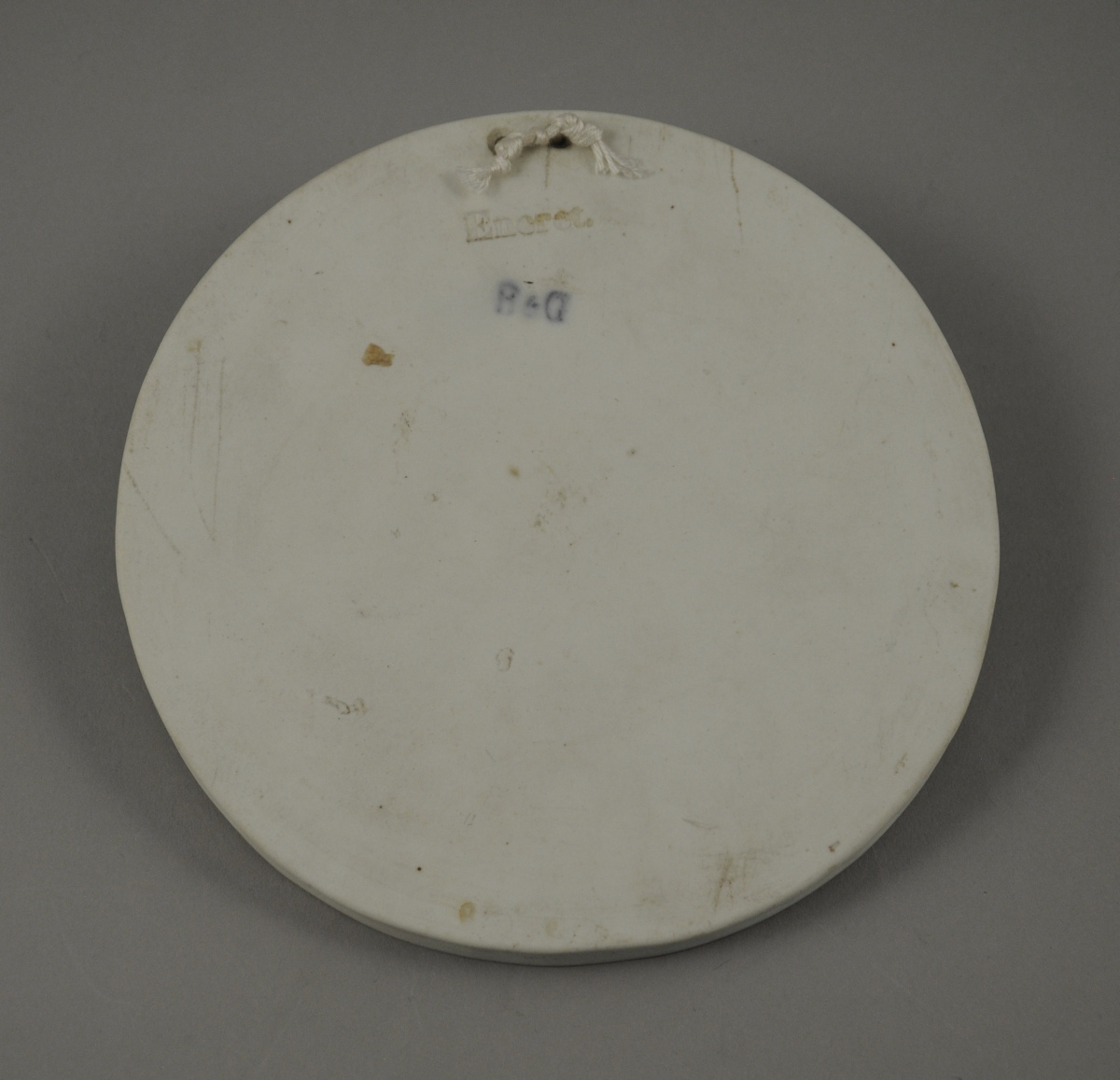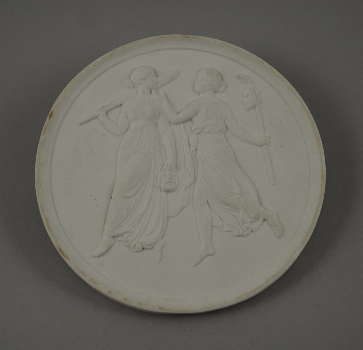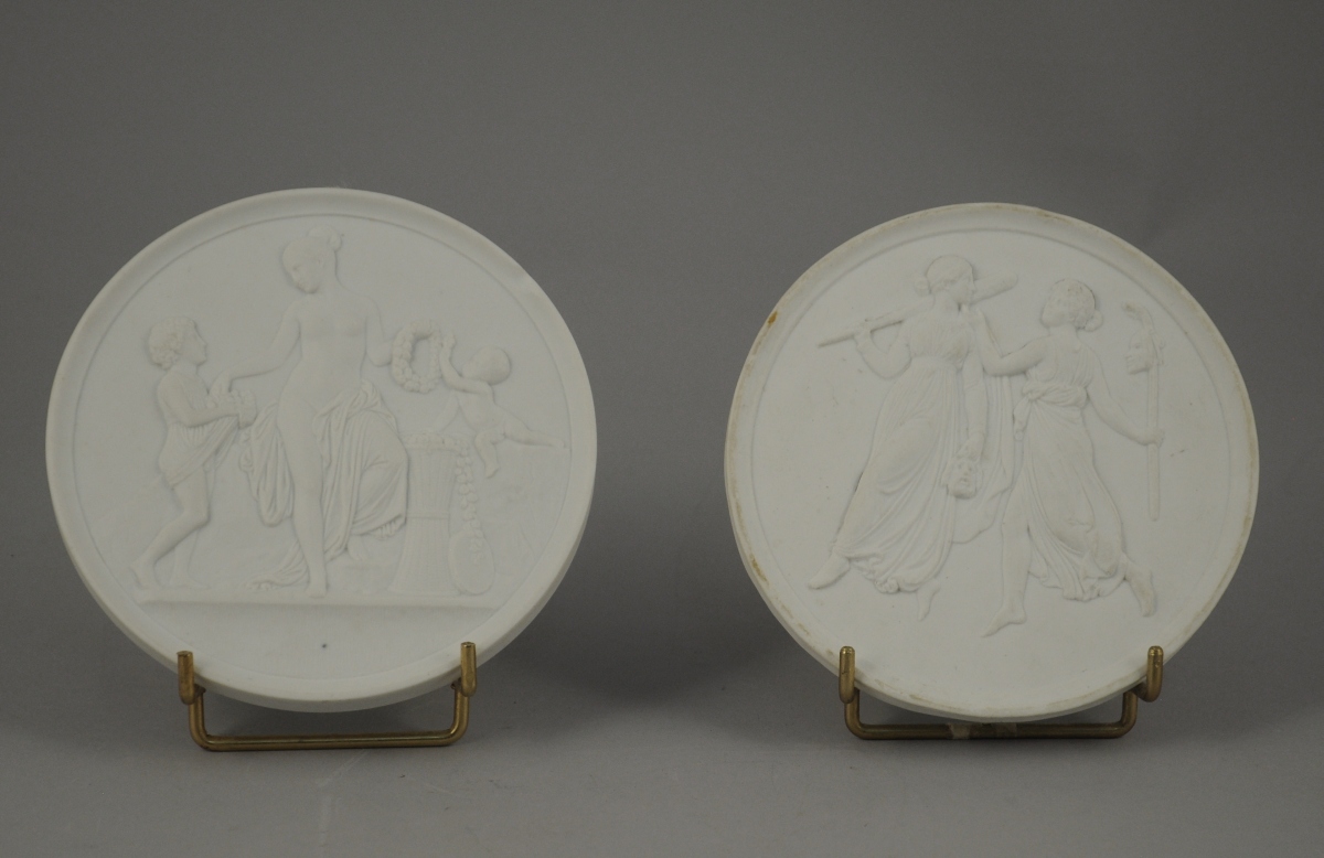 FRANCE (?). DEUX MÉDAILLONS circulaire formant paire en biscuit. Décor d'une scène à l'Antique. Signés "Encret".