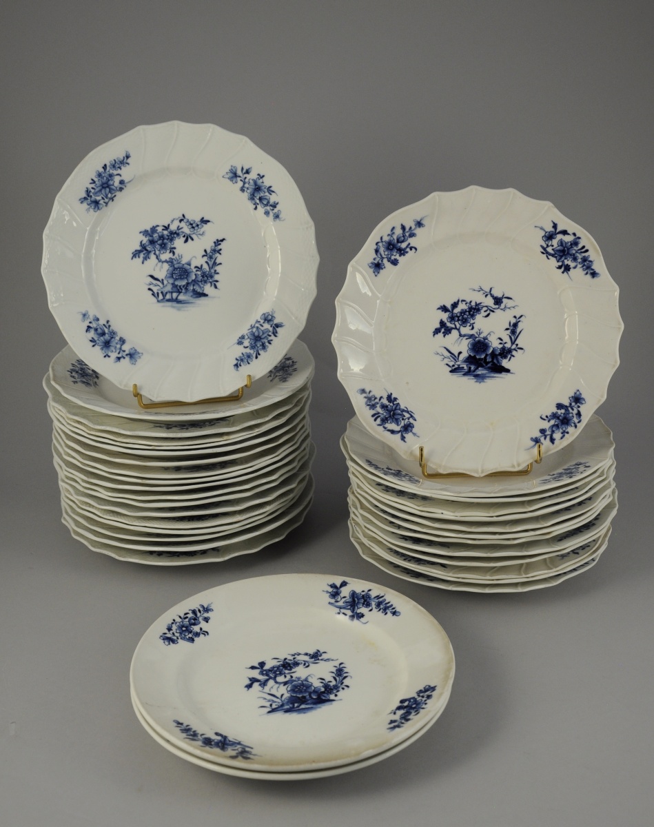 30 à bords chantournés ornés de côtes torses dont 18 présentant un décor de vannerie sur le bord de l'aile. Deux assiettes de forme ronde et une à bords chantournés.