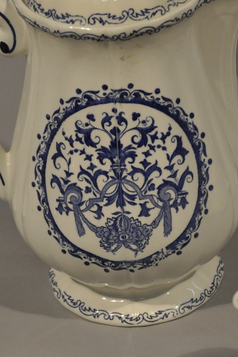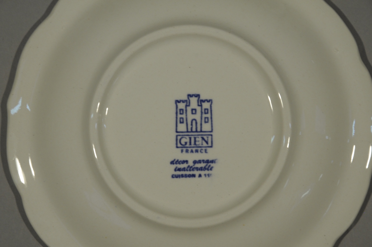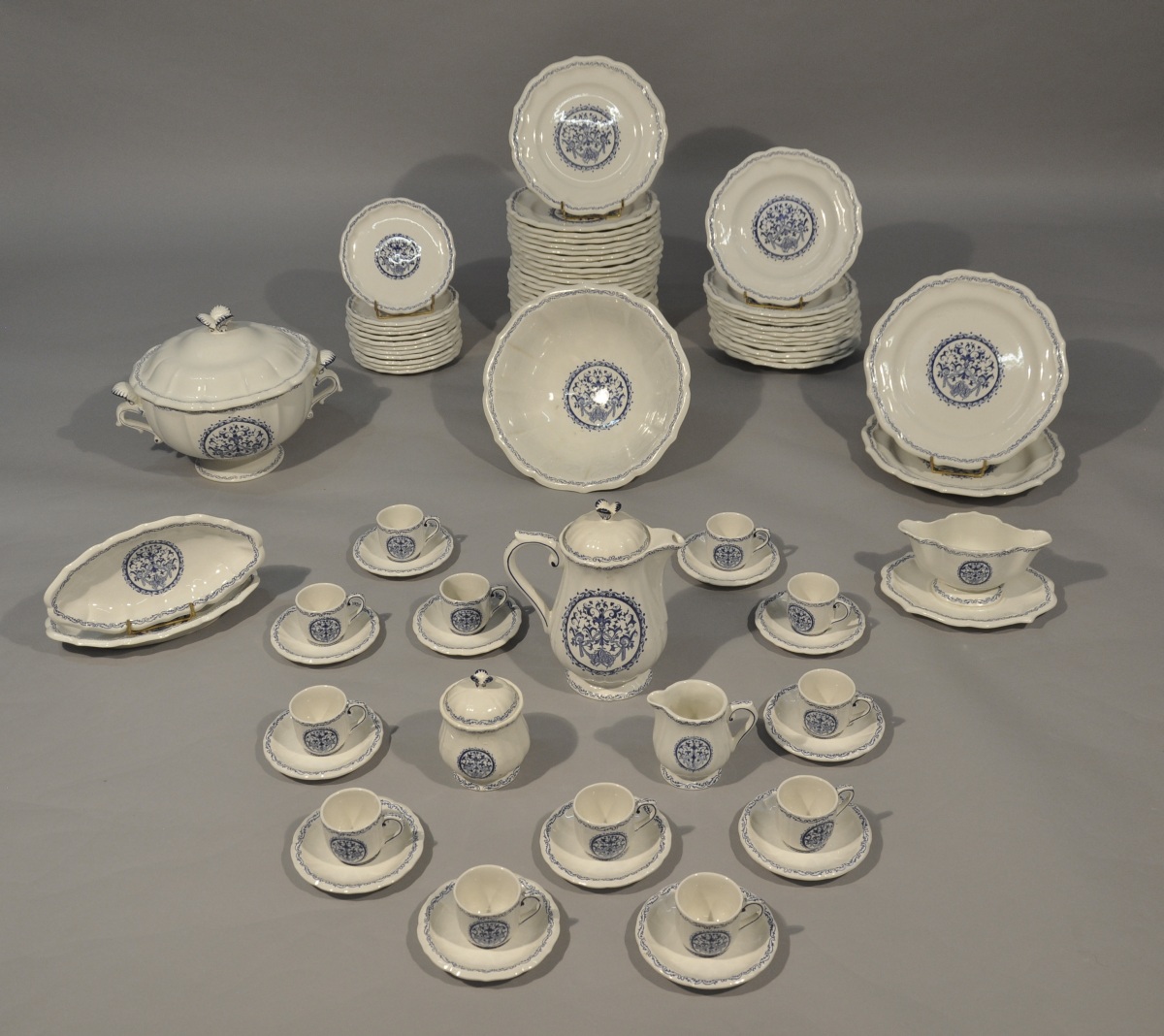 GIEN. SERVICE DE TABLE et SERVICE À CAFÉ, en faïence, 82 pièces, modèle "ROUEN" à décor en camaïeu bleu de rinceaux, ferronneries, bouquet floral et frises feuillagées. Les fretels formés de trois coquilles. Le service de table à bords chantournés se compose de 24 assiettes plates, 12 assiettes creuses, 12 assiettes à dessert, un plat, un plat creux, 2 raviers, une saucière et son plateau adhérent, un saladier et un pot-à-oille à côtes, les prises latérales agrémentées d'une coquille. Le service à café à côtes se compose d'une cafetière, d'un pot-à-lait, d'un sucrier et de 12 tasses et leurs sous-tasses.