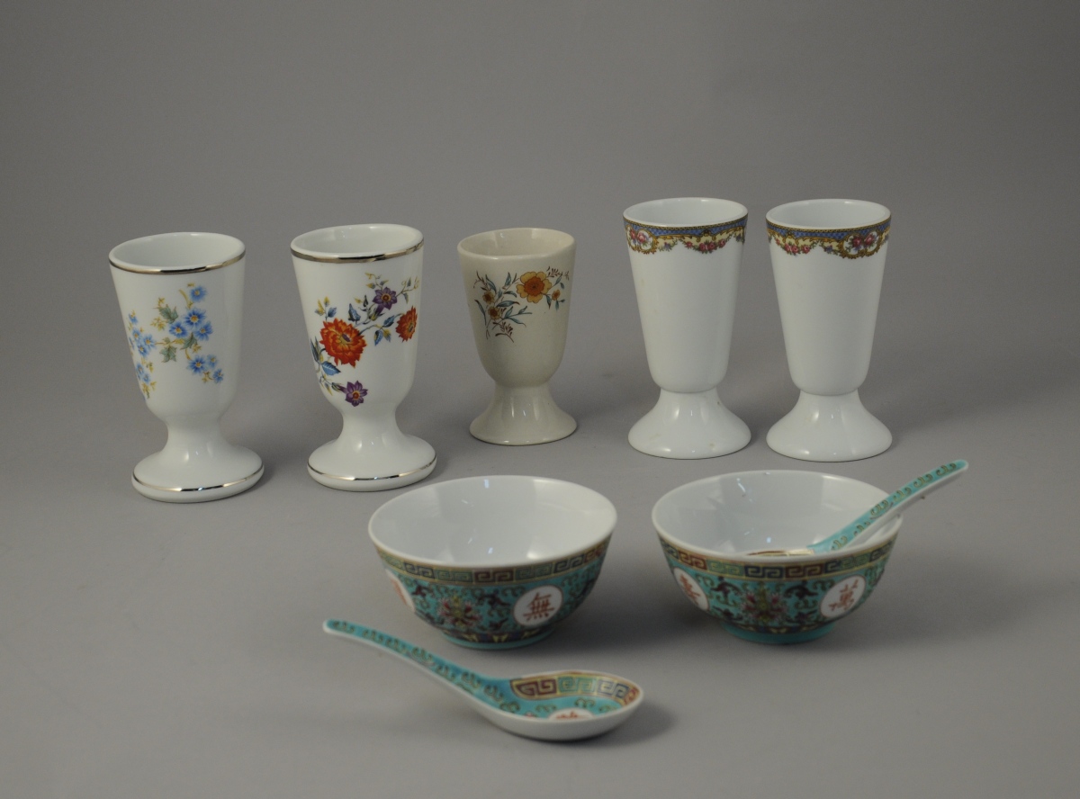 5 MAZAGRANS en porcelaine et 2 BOLS et leurs CUILLÈRES en porcelaine dans le goût de la Chine.