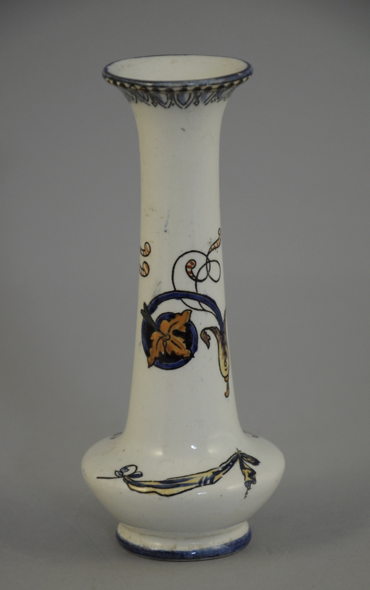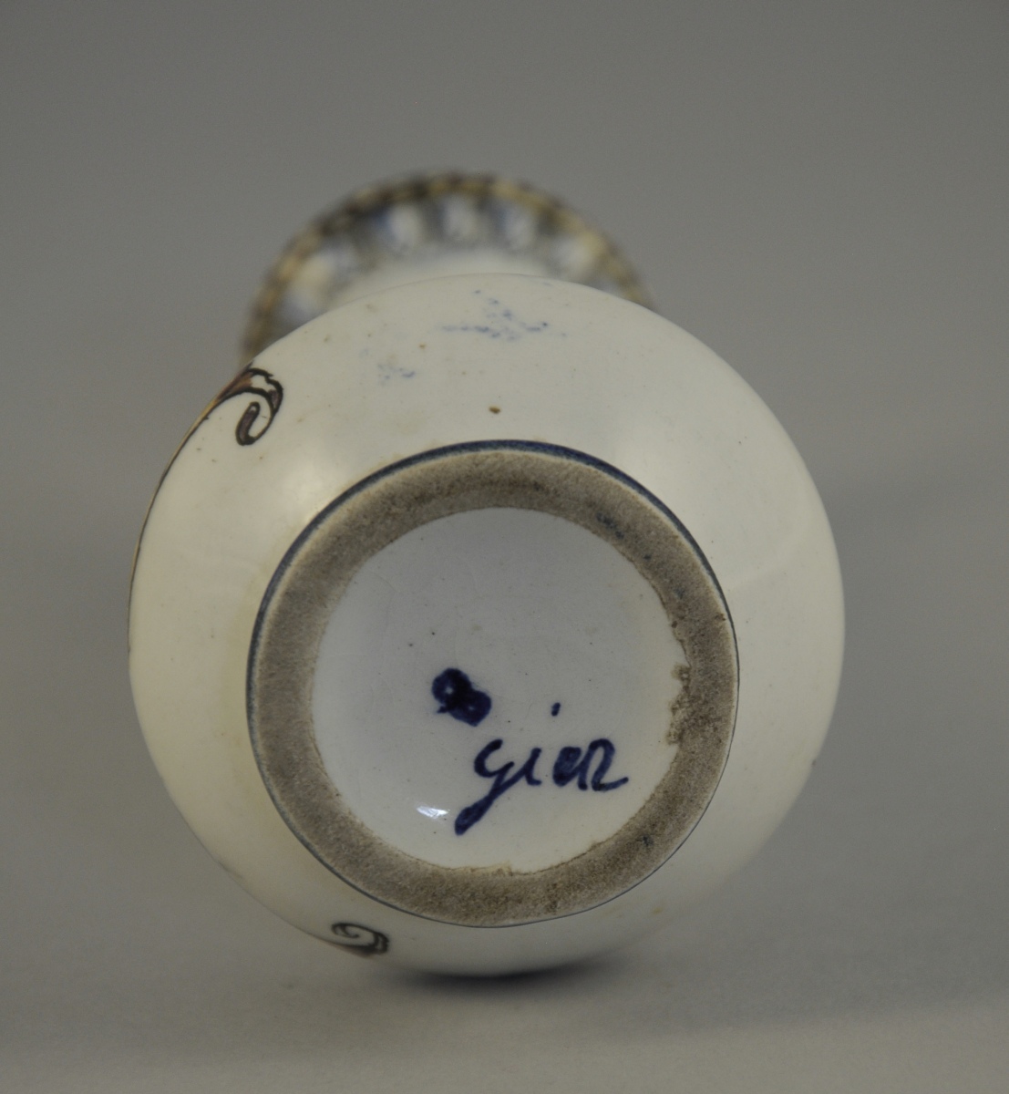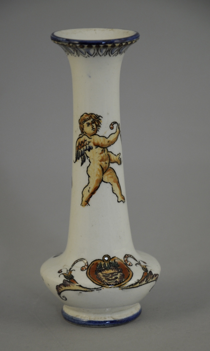 GIEN. VASE SOLIFLORE à panse basse en faïence à décor polychrome renaissant d'un amour, mascaron et rinceaux.