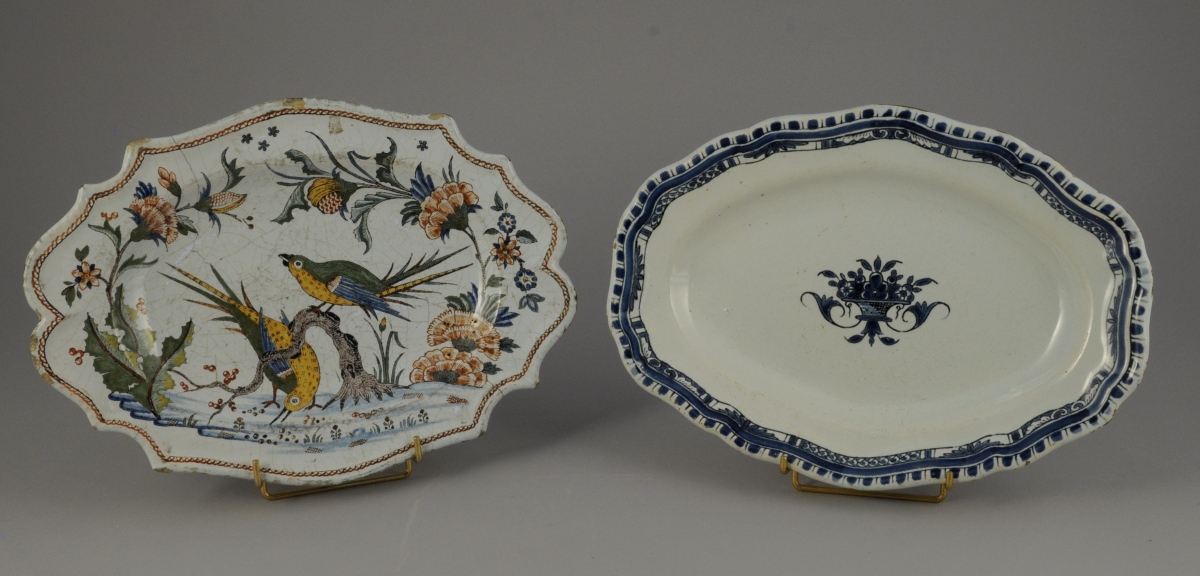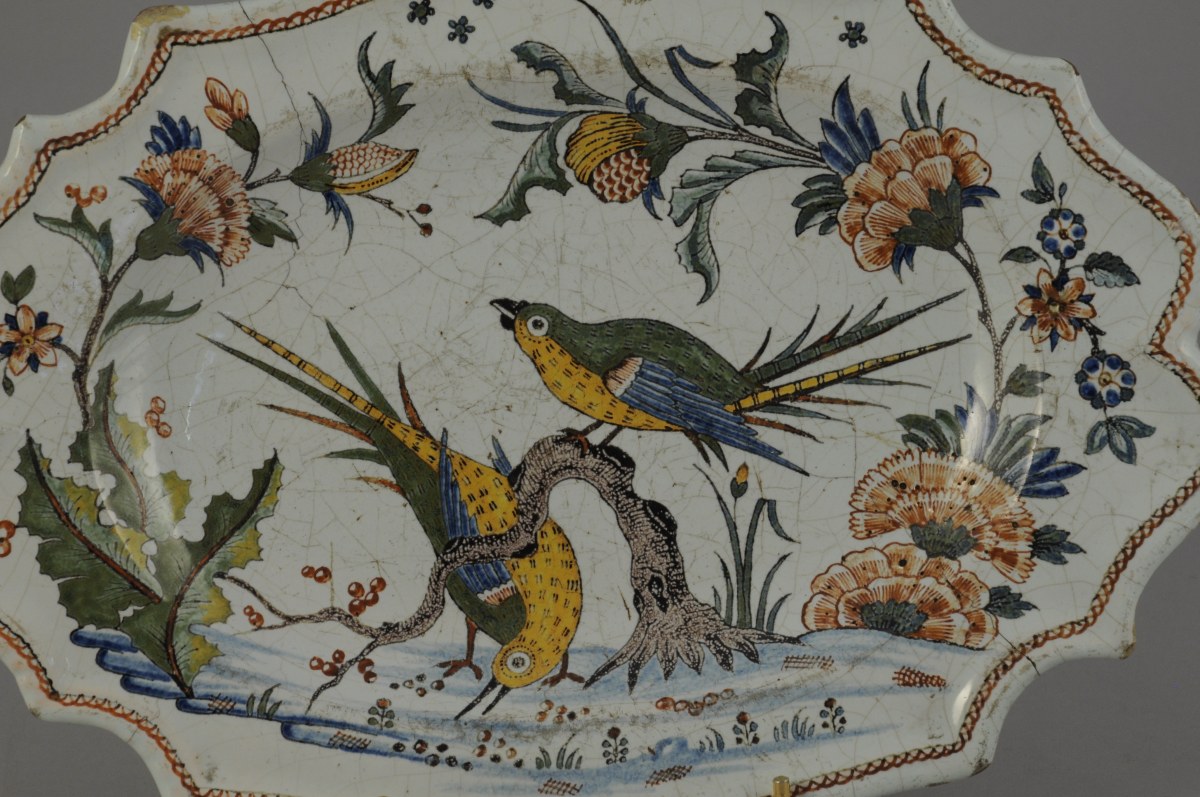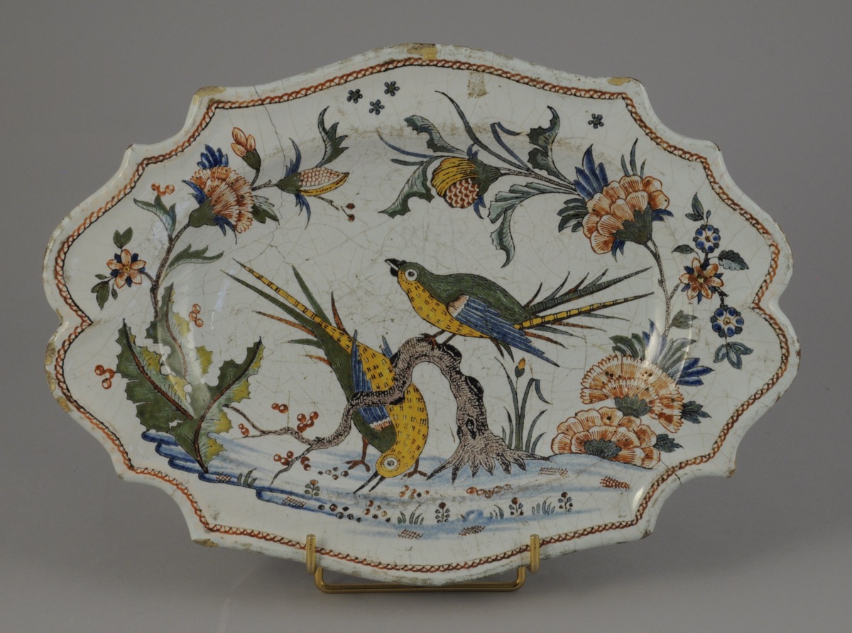 ROUEN. PLAT oblong à bords chantournés à décor polychrome d'oiseaux et de branchages fleuris.