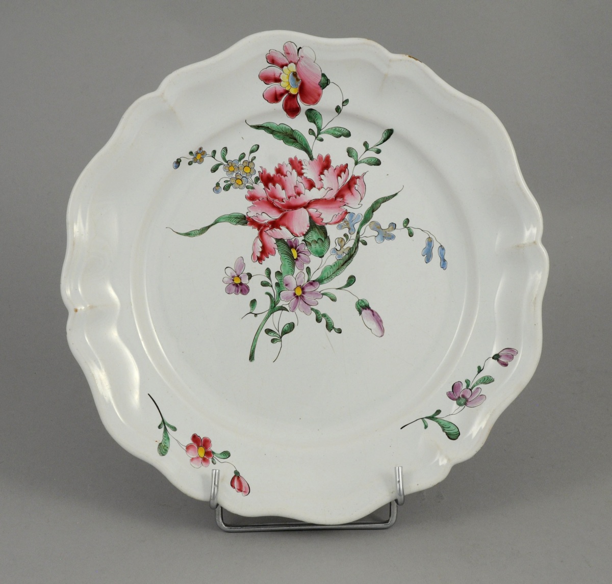 STRASBOURG. PAIRE D'ASSIETTES à bord contourné, décor polychrome d'un bouquet de fleurs décentré et sur l'aile de fleurettes. Manufacture de Joseph Hannong. Marquée "JH 39" et "JH 60".