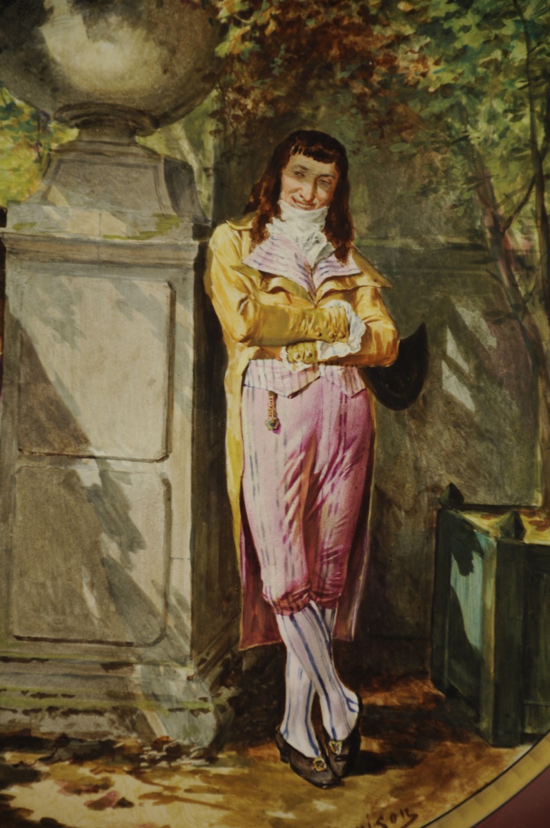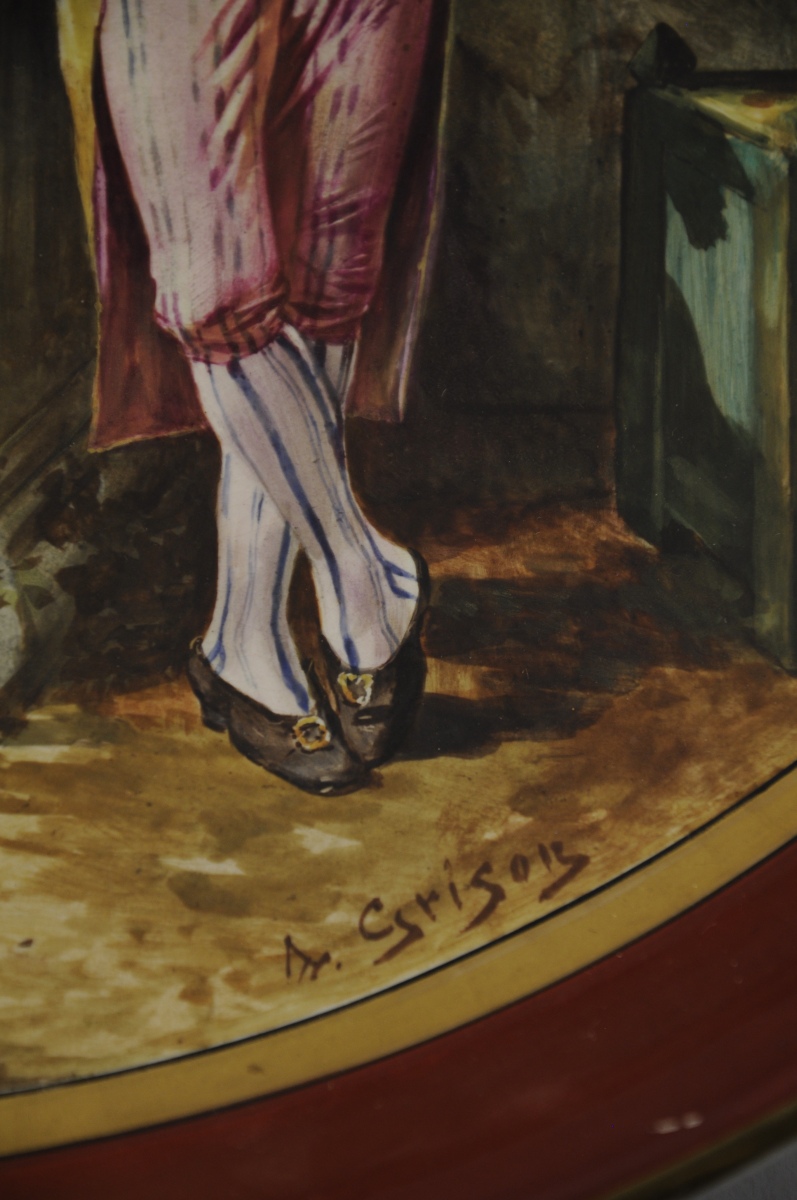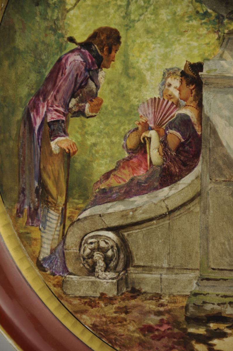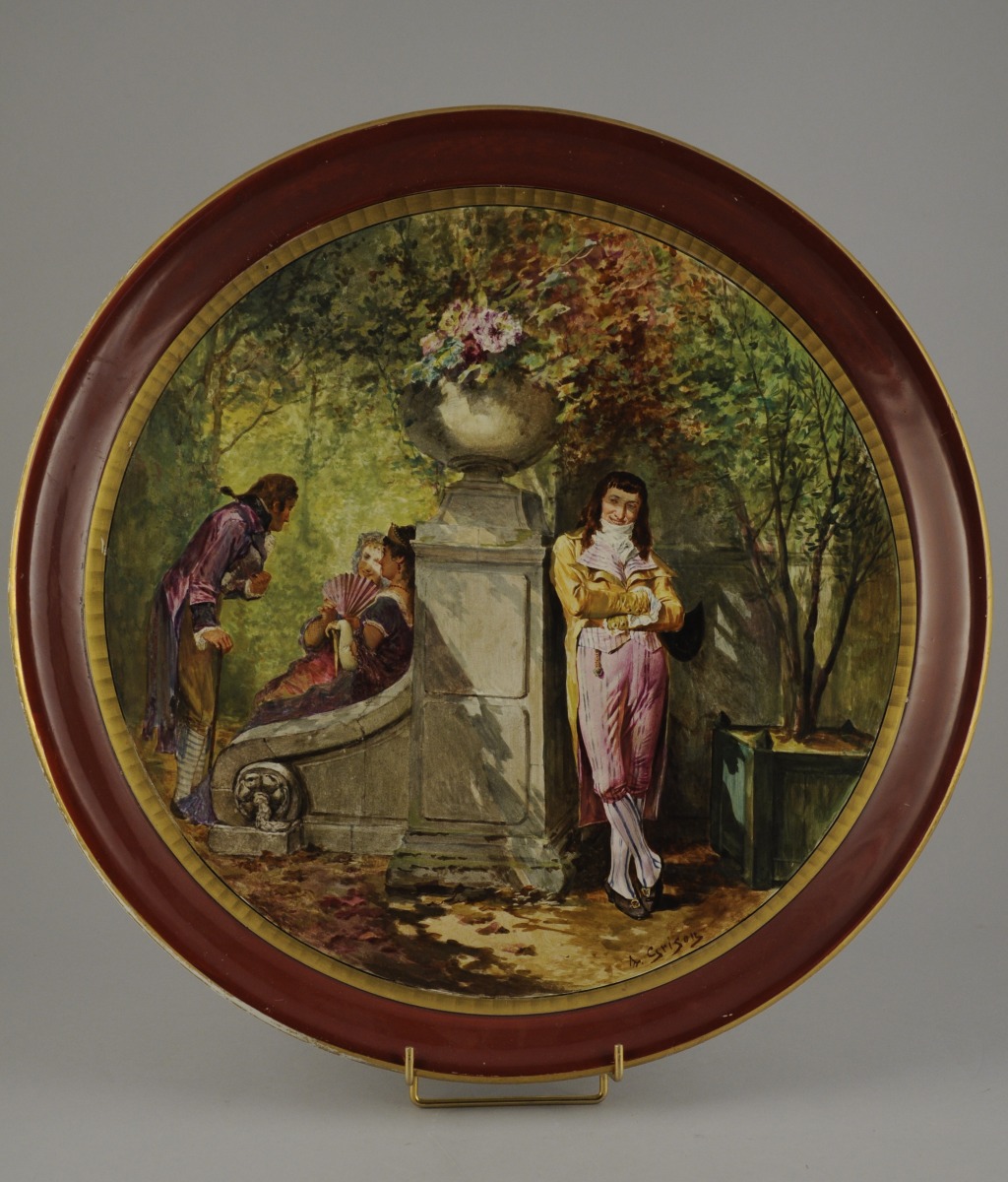 CREIL ET MONTEREAU. GRAND PLAT de forme circulaire en faïence à décor polychrome d'une scène galante figurant deux incoyables et deux jeunes femmes dans un parc arboré. Signé Grisois. Liseré or et aile rouge.