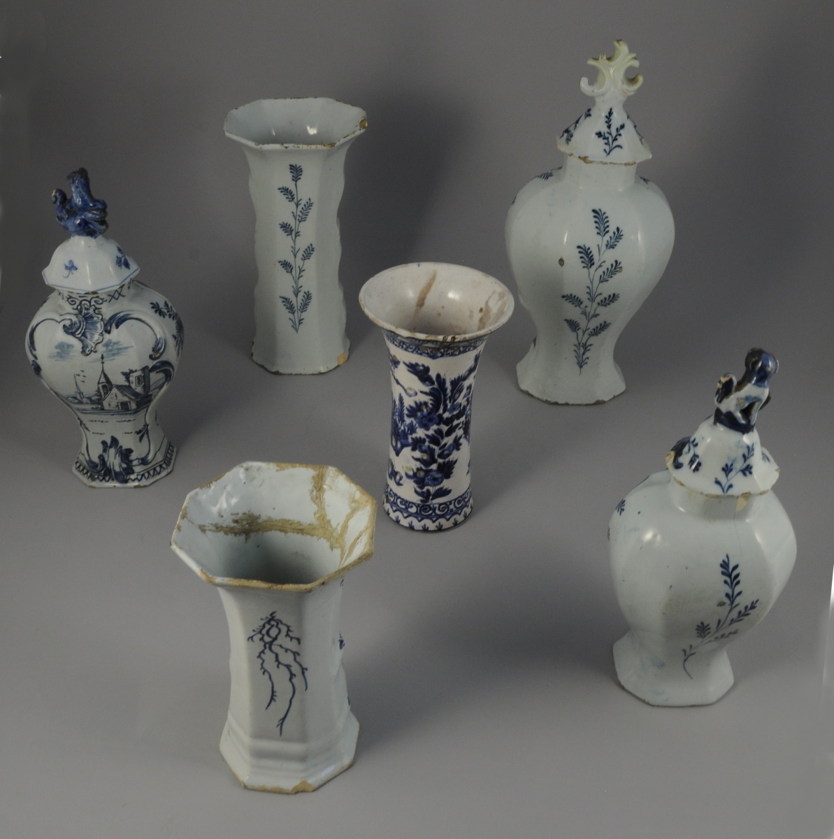 PARTIE de GARNITURE composée d'une POTICHE couverte de forme balustre et d'un VASE cornet à pans à décor en camaïeu de bleu d'un important bouquet de fleurs dans des réserves feuillagées.