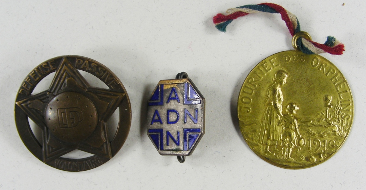 LOT DE TROIS INSIGNES : un insigne de volontaire de la Défense Passive en bronze par Arthus Bertrand, fixation par épingle ; un insigne des Assistantes du Devoir National (ADN), métal argent et émail, par Arthus Bertrand, fixation par épingle ; un insigne de la journée des orphelins 1916 en métal doré.