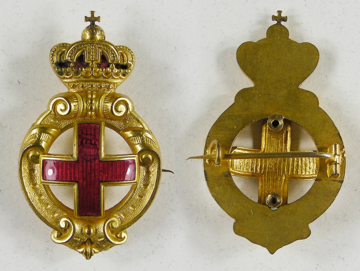 Bulgarie - INSIGNE D'HONNEUR DE LA CROIX-ROUGE, premier type en bronze doré ajouré et émaillé (cheveux), fixation par épingle basculante.