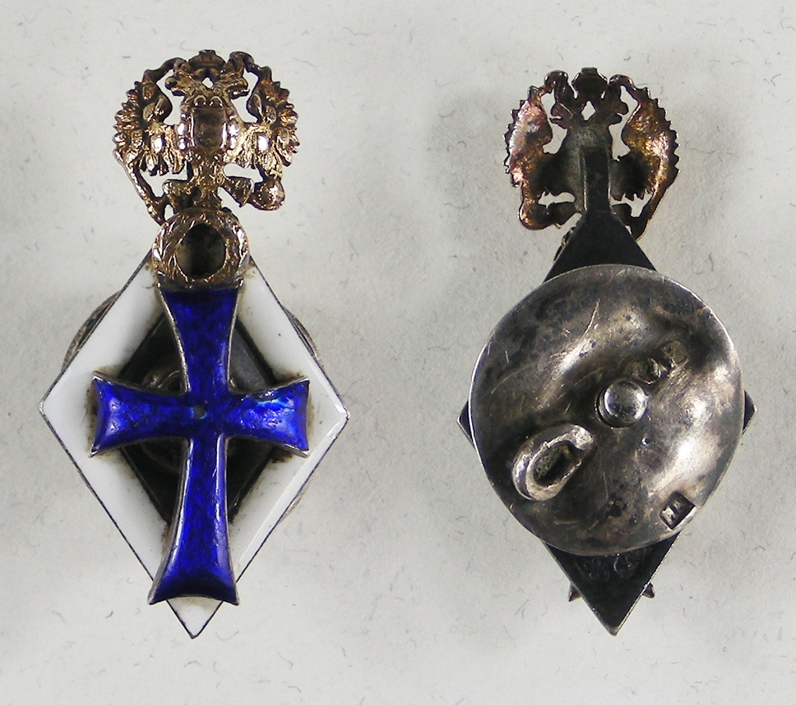 Russie - INSIGNE de bachelier, réduction de boutonnière en vermeil et émail (éclat de surface sur le bleu), fixation par vis et écrou (tordu et accidenté), poinçon 88 kokochnik à gauche (1896-1908), et de fabricant non identifié.