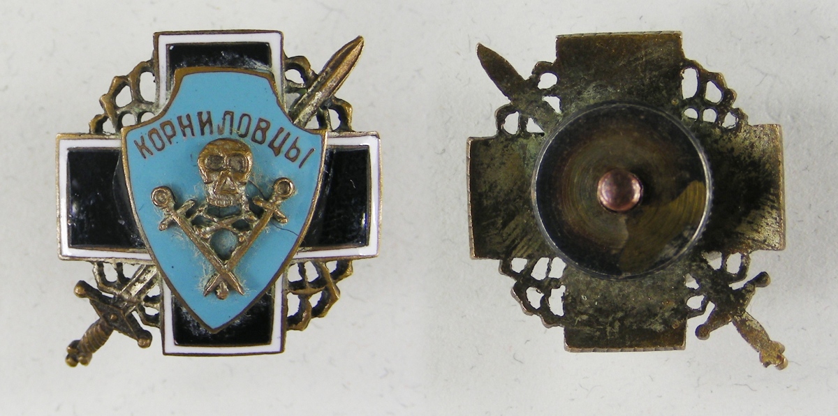 Russie - Guerre Civile, INSIGNE du régiment de choc de Kornilov, réduction de boutonnière en métal argenté, doré et émaillé, fixation par vis et écrou, fabrication d'émigration.