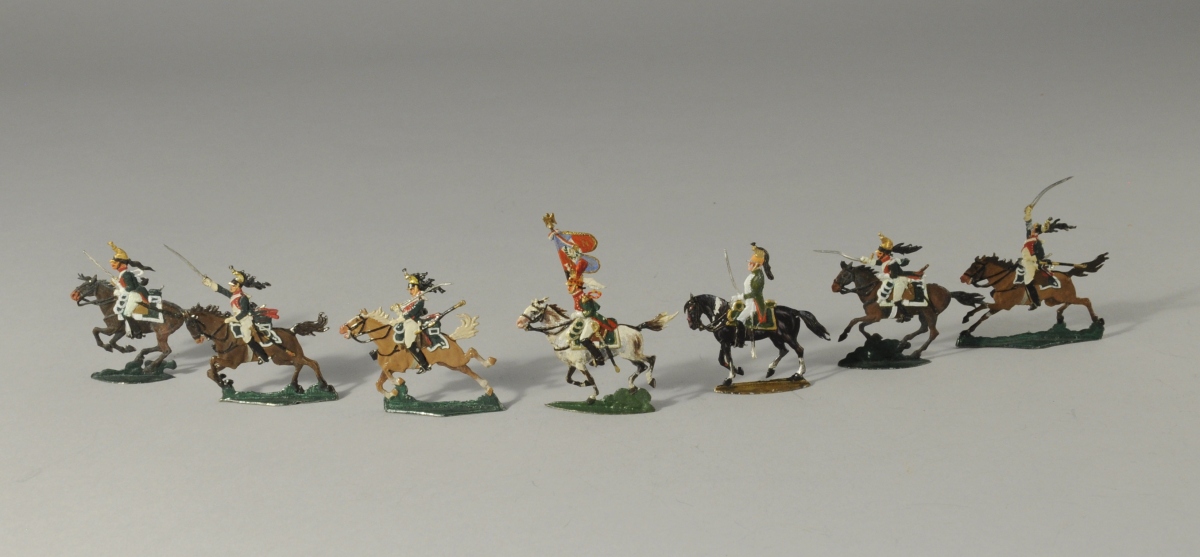SOLDATS de PLOMB peints à la main. 16 pièces. Dragons à uniforme vert et rouge. Un porte drapeau.