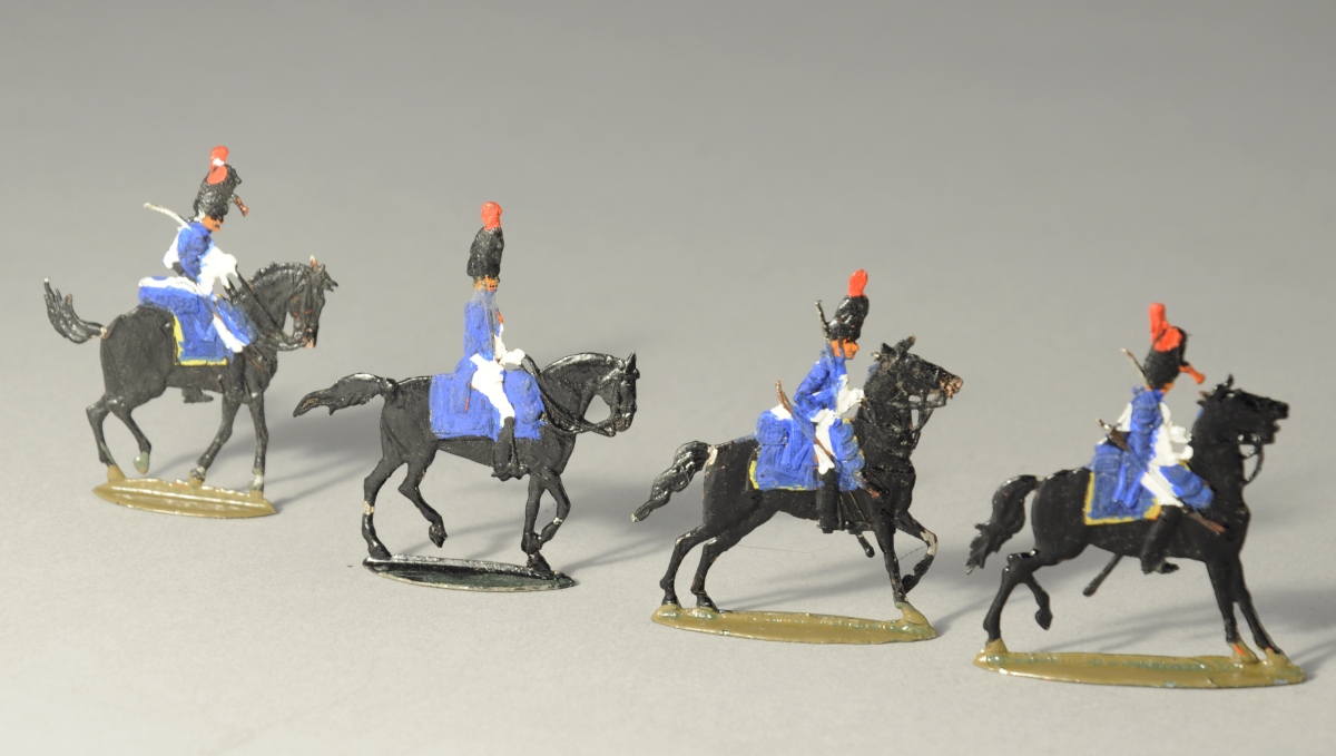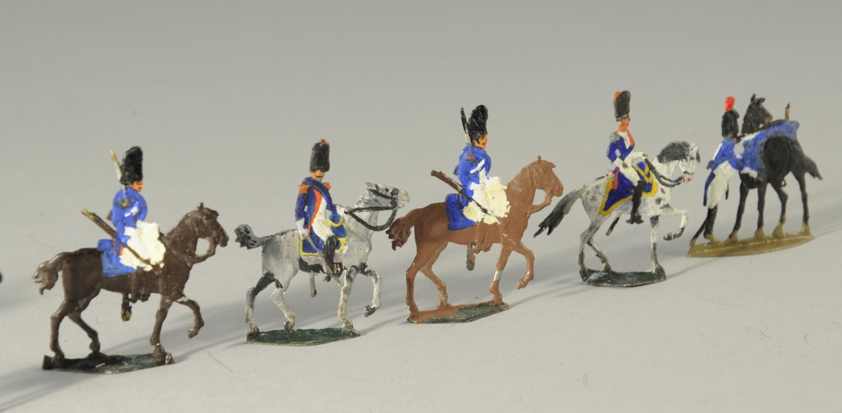 SOLDATS de PLOMB peints à la main. 21 pièces. Cavalerie, 1 drapeau. Divers officiers.