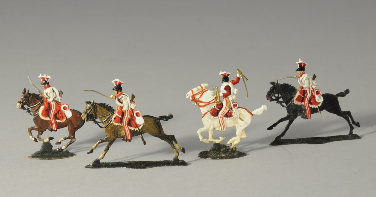 SOLDATS de PLOMB peints à la main. 21 pièces. Cavaliers à habit blanc et rouge dont un officier.