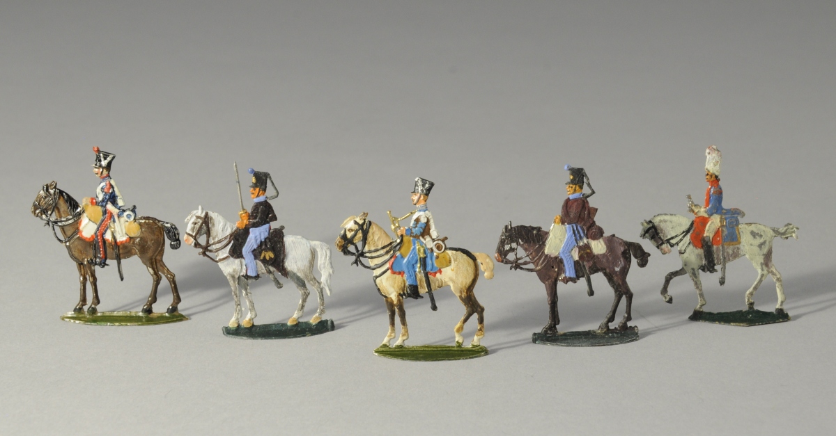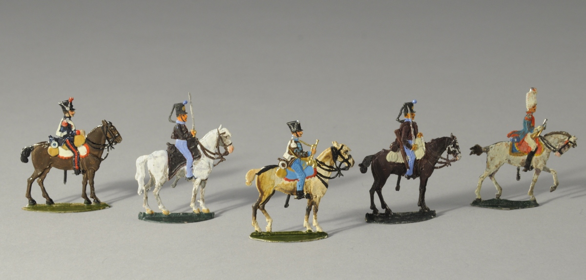 SOLDATS de PLOMB peints à la main. 18 pièces. Officiers à cheval et cavaliers de divers corps d'armée et pays.