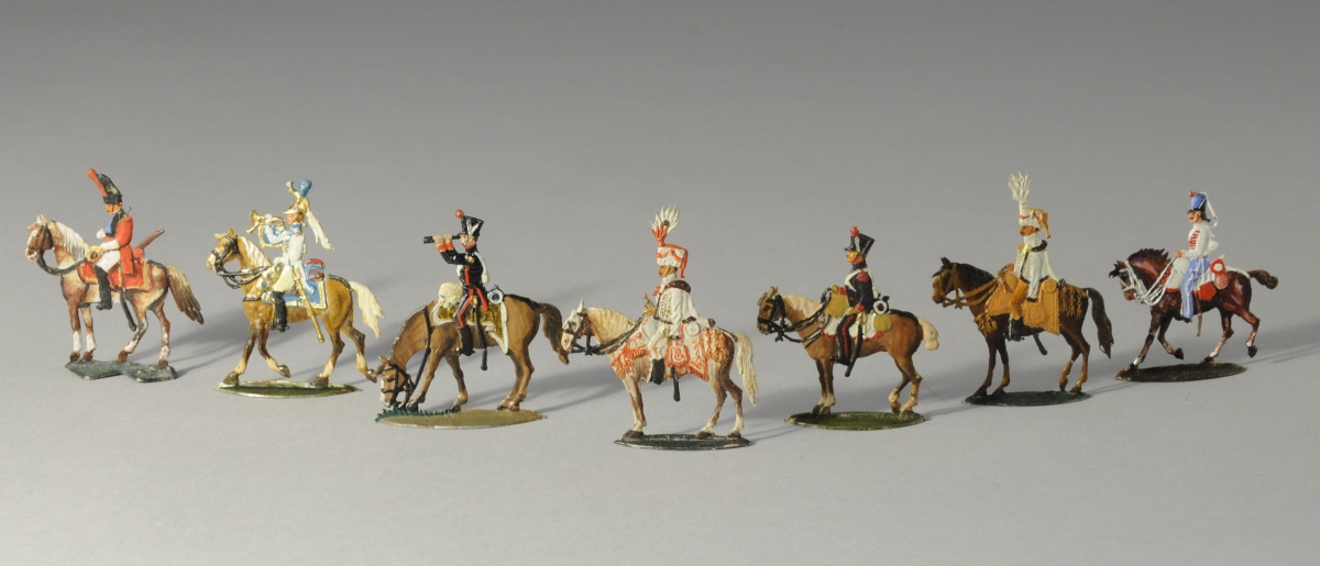 SOLDATS de PLOMB peints à la main. 17 pièces. Officiers à cheval et cavaliers de divers corps d'armée et pays.