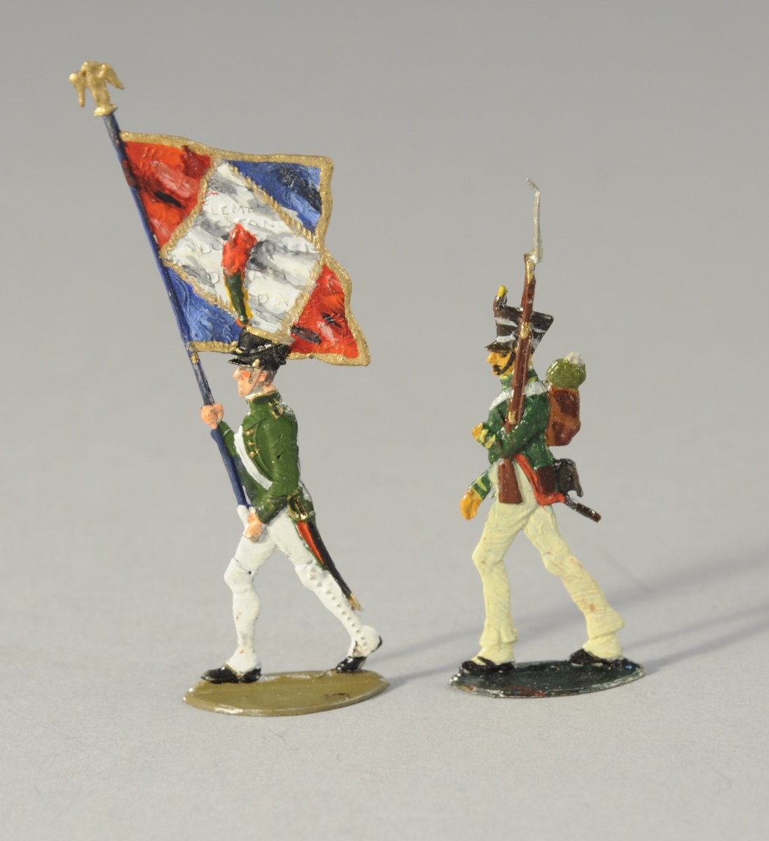 SOLDATS de PLOMB peints à la main. 28 pièces. Fantassins à uniforme blanc et bleu dont un porte drapeau.