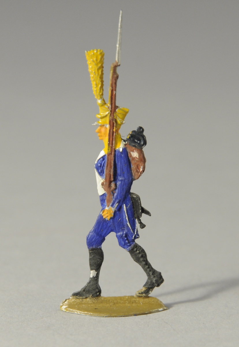 SOLDATS de PLOMB peints à la main. 19 pièces. Fanatassins à uniforme bleu et plumet jaune.