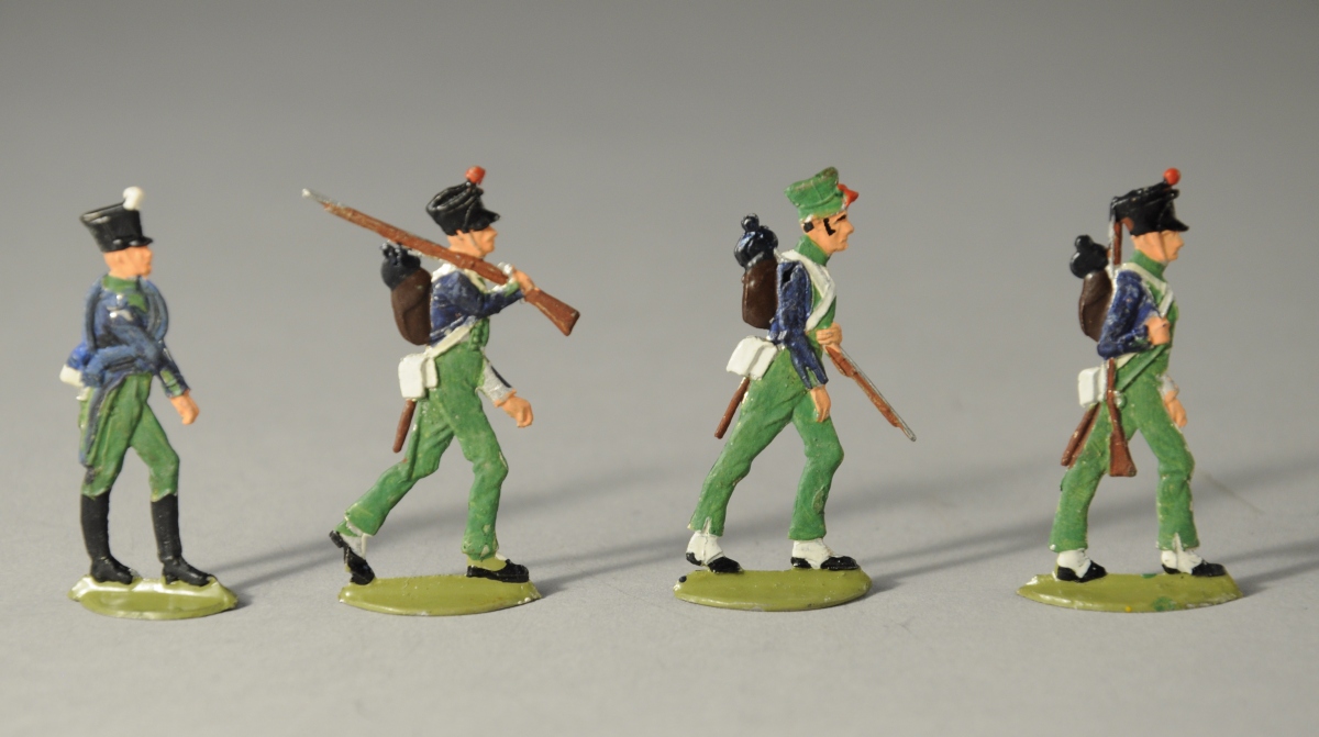 SOLDATS de PLOMB peints à la main. 13 pièces. Fantassins à uniforme vert clair.