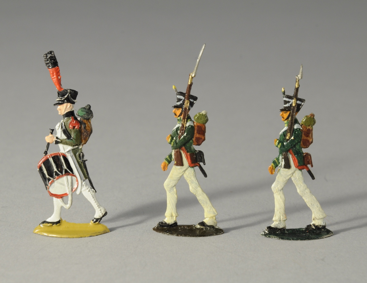 SOLDATS de PLOMB peints à la main. 16 pièces. Uniforme vert, blanc et rouge. 8 tambours à plumet rouge et noir. 8 fantassins dont un officier.