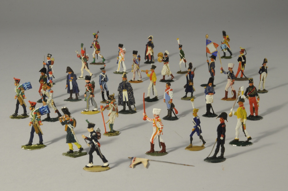 SOLDATS de PLOMB peints à la main. 34 pièces. Divers officiers, tambours, soldats, portes drapeau, trompette, chef de fanfare de différents corps et pays.