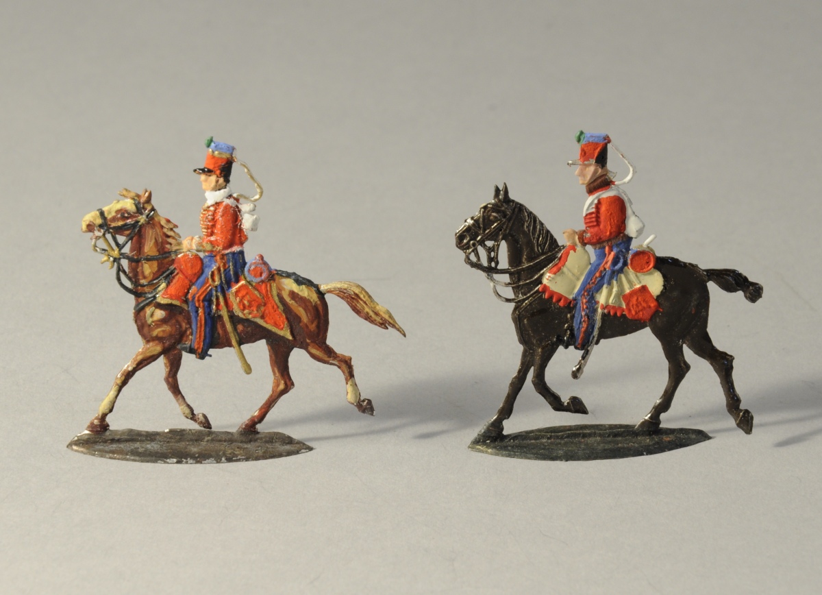 SOLDATS de PLOMB peints à la main. 18 pièces. Cavaliers à uniforme bleu et rouge, dont un officier.