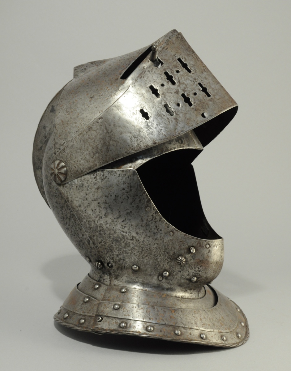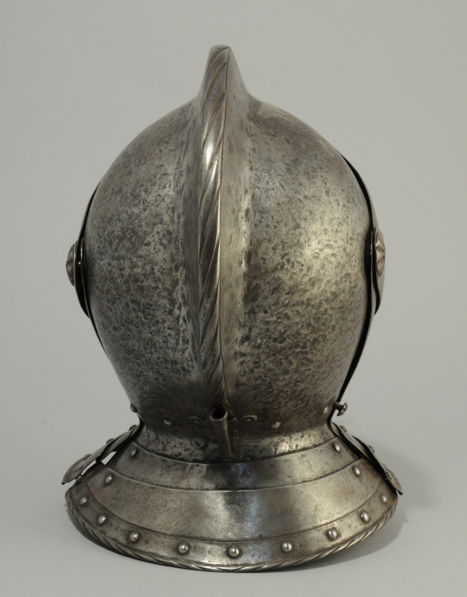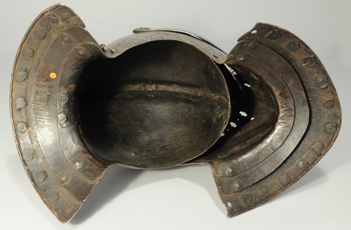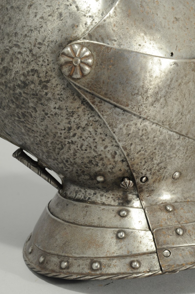 ARMET de style XVIe en fer forgé . Timbre surmonté d'une crête striée, avec porte plumet à la base sur l'arrière. Visière à deux fentes à division centrale. Mézail ajouré à rosaces godronnées. Mentonière en forme et gorgerin bordé de rivets ronds, bord arrondi et strié.