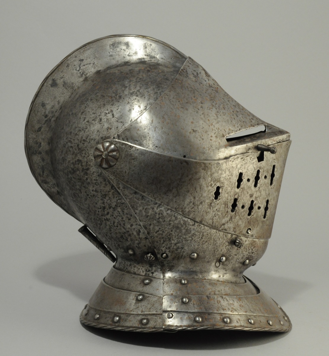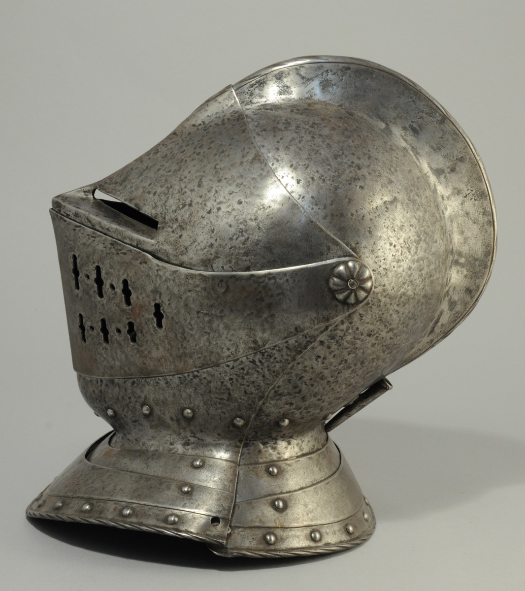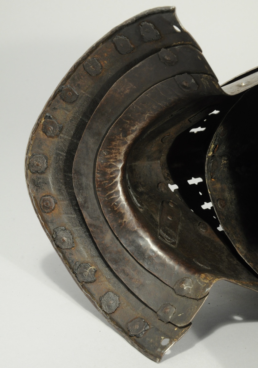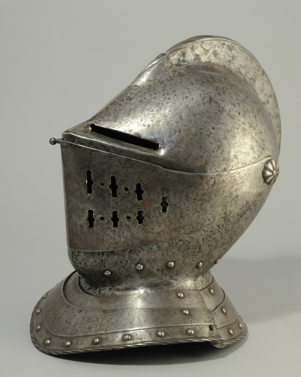 ARMET de style XVIe en fer forgé . Timbre surmonté d'une crête striée, avec porte plumet à la base sur l'arrière. Visière à deux fentes à division centrale. Mézail ajouré à rosaces godronnées. Mentonière en forme et gorgerin bordé de rivets ronds, bord arrondi et strié.