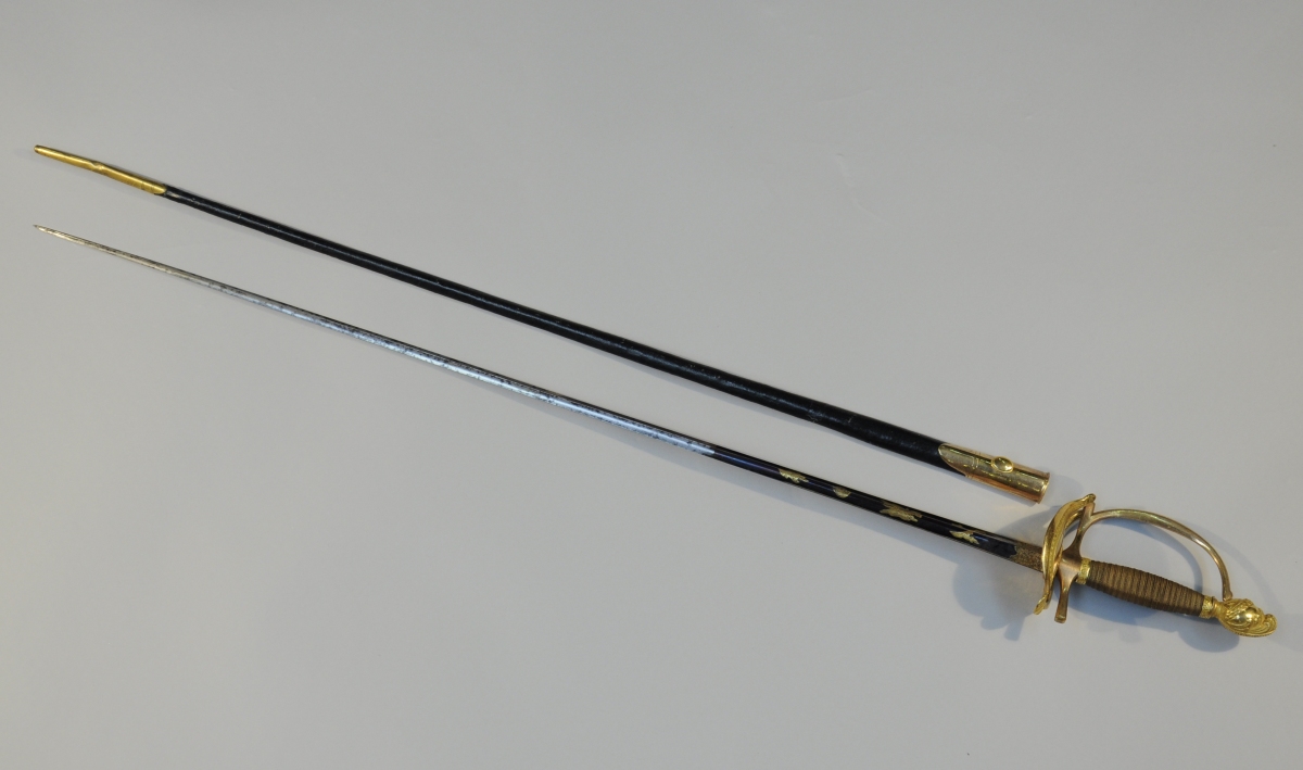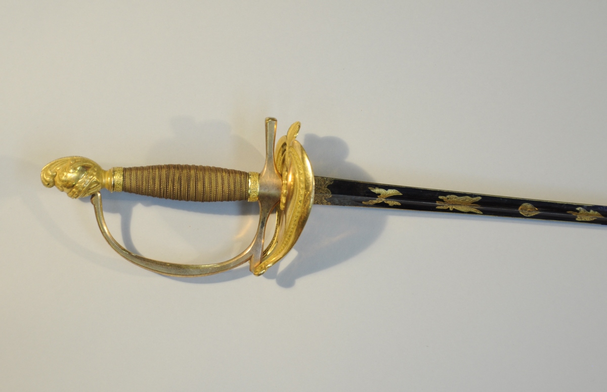 ÉPÉE D'UNIFORME, premier modèle. La poignée en bronze redoré de deux tons. Plateau en lyre asymétrique avec frise feuillagée sur le pourtour et coquille. Quillons droits quadrangulaires, fusée filigranée et pommeau au casque empanaché du modèle d'officier d'état-major Vendémiaire. Lame triangulaire gravée IGB bleuie au tiers et ciselée de trophées, soleil et motifs feuillagés dorés. Fourreau en cuir à deux garnitures de laiton redorées. La chappe à pontet ovale.