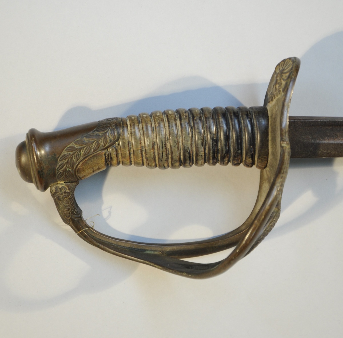SABRE D'OFFICIER DE CAVALERIE, modèle 1822-83. Poignée en corne (manque le filigrane), monture en laiton ciselée de feuillages. Lame droite à dos plat et pans creux. (forte oxydation)