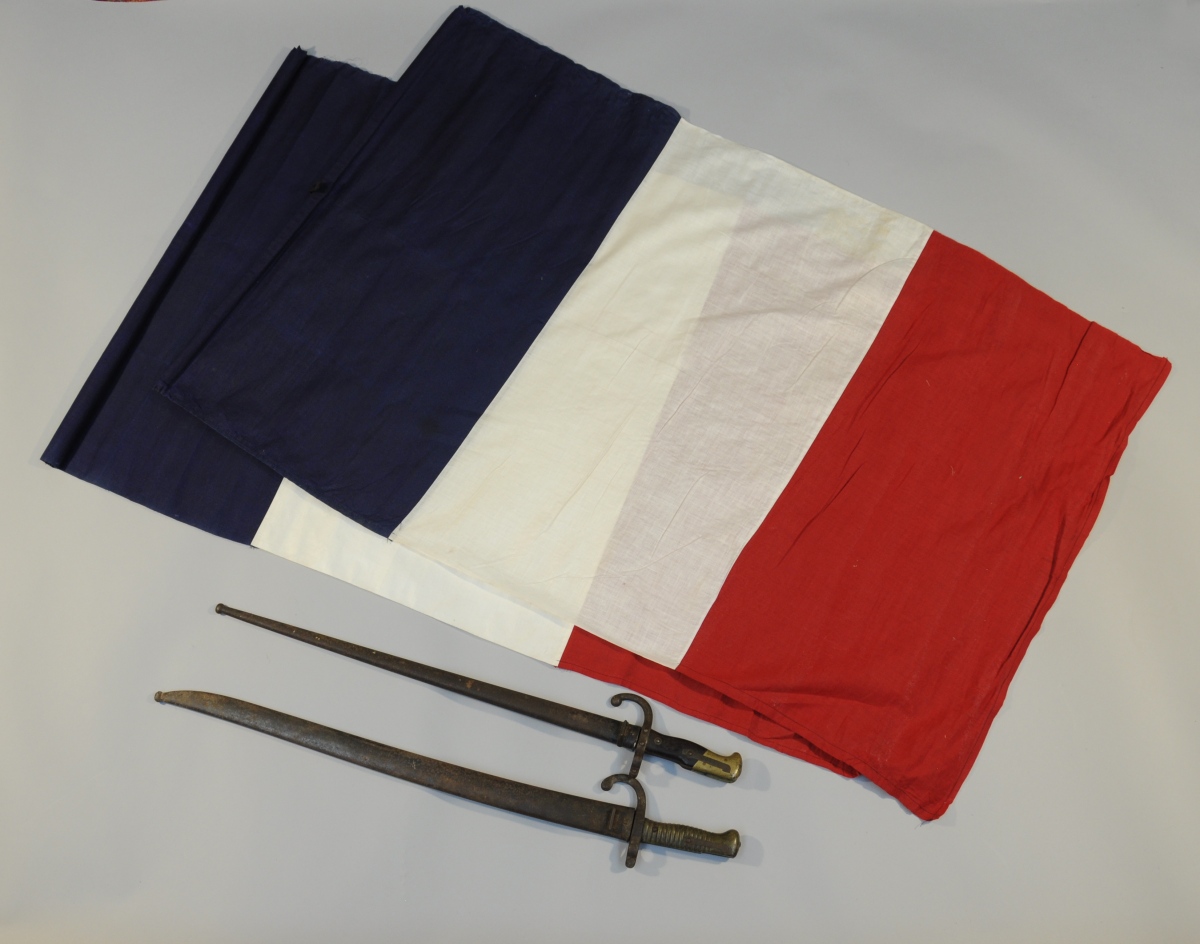 DEUX DRAPEAUX FRANÇAIS anciens en tissu autrefois agrémentés d'une croix de Lorraine.