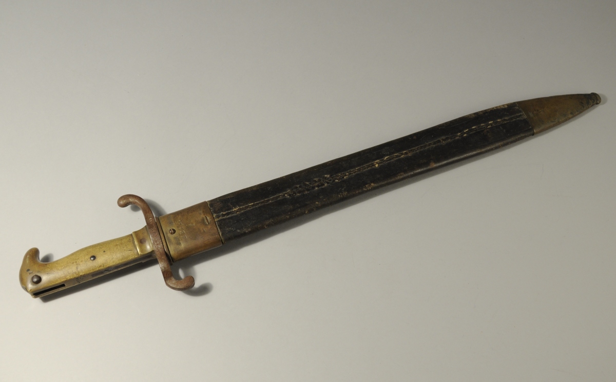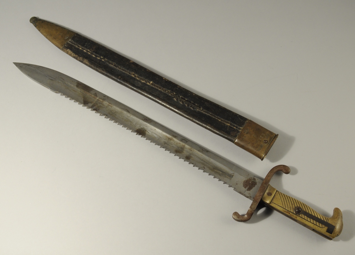 PRUSSE. BAÏONNETTE DE PIONNIER, modèle 1865-1871. Lame à 75 dents de scie poinçonnée, marquée "V.JUNG & S. / SUHL / G" et datée 70. Croisière en fer à quillons inversés numérotée "15.P. 5. 140". Poignée en laiton striée. Fourreau en cuir à deux garnitures de laiton. Chappe marquée "E.B.1.16" et poinçonnée.