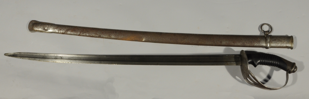 CHILI. SABRE de cavalerie lourde. Monture, garde à coquille. Lame droite à pans creux. Fourreau en tôle de fer à un bracelet.