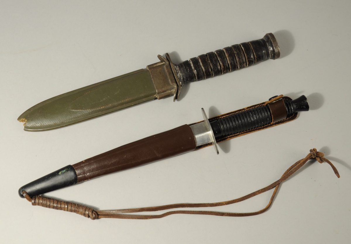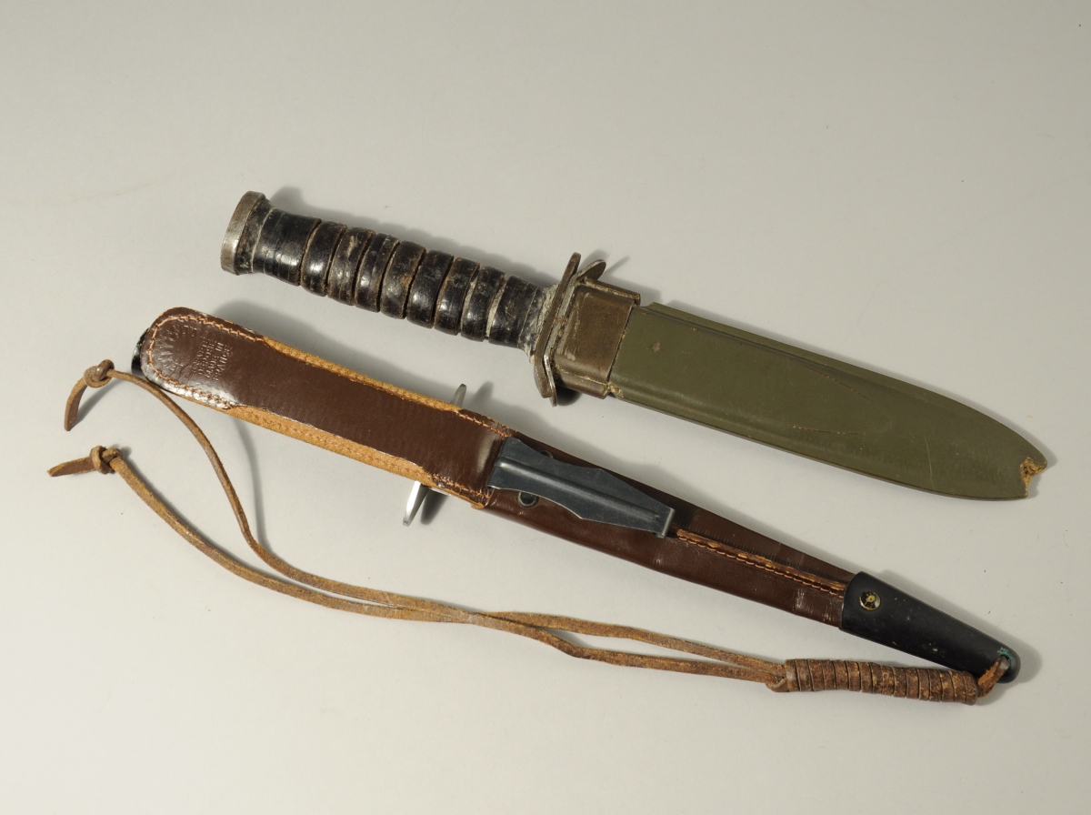 ÉTATS-UNIS. POIGNARD US M3 CASE. Lame à tranchant et contre-tranchant (manque à la pointe). Garde marquée "U.S.M.3 / CASE". Poignée à rondelles de cuir. Fourreau en tissu enduit vert olive (manque à la pointe). Chape en tôle marquée "U.S. M8 B.M. CO".