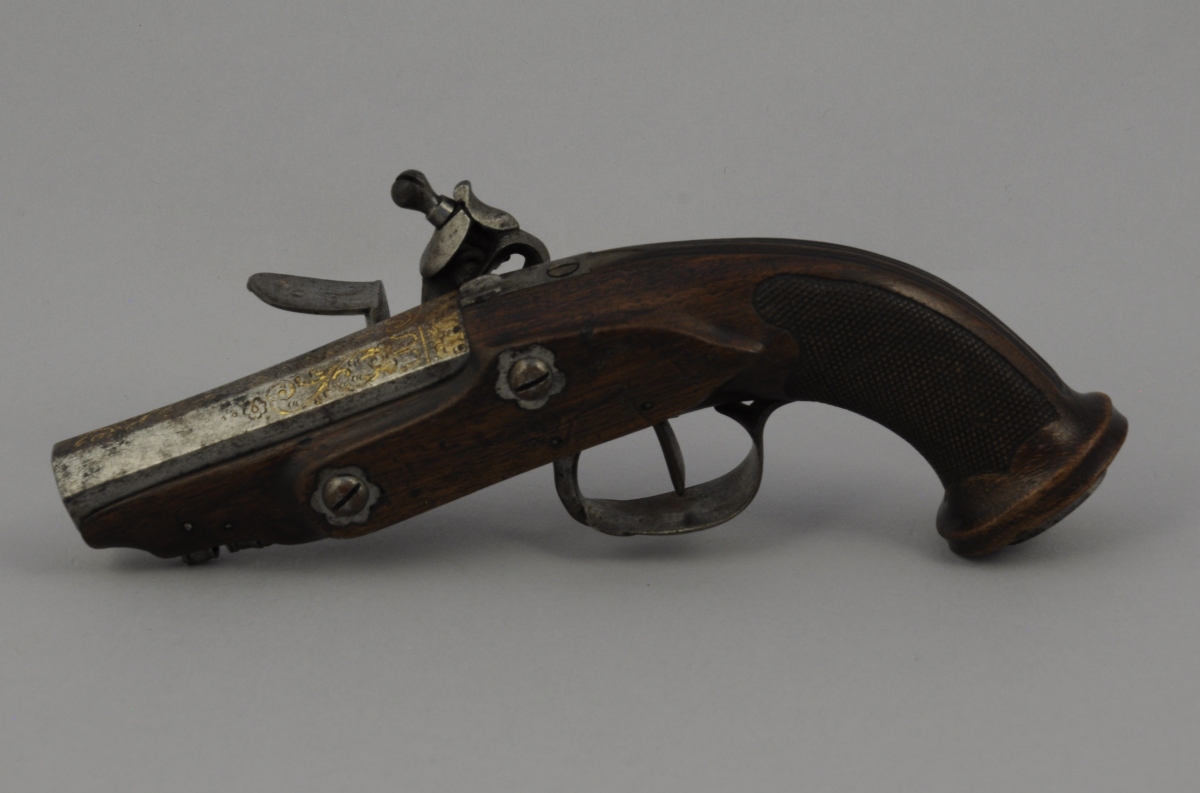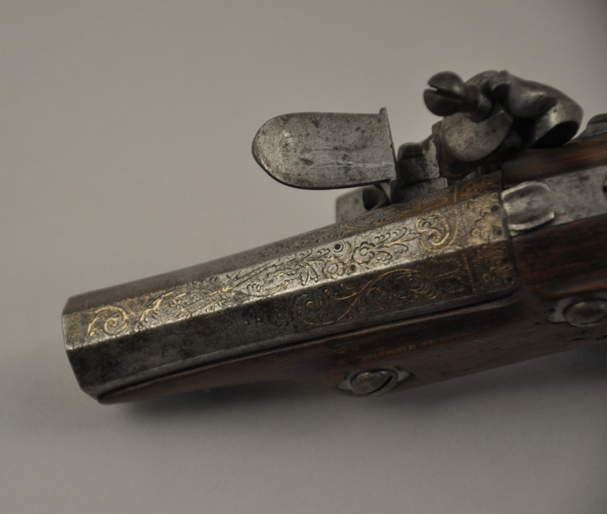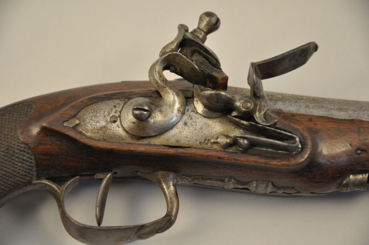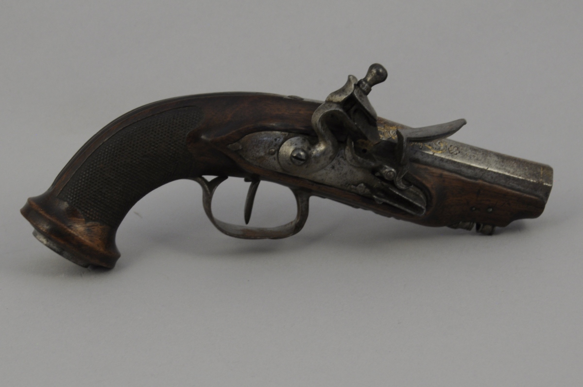 PISTOLET À SILEX DE VOYAGE OU D'OFFICIER. Canon à pans ciselé et doré de rinceaux et frises feuillagées, chien à col de cygne. Garnitures en fer. Crosse en noyer quadrillée et cannelée.