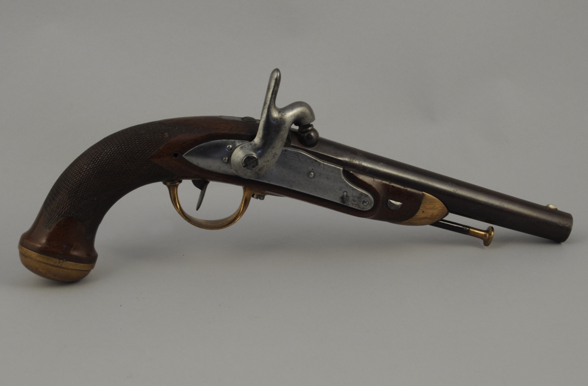 PISTOLET À SILEX, TRANSFORMÉ À PERCUSSION, D'OFFICIER MODÈLE 1816. Canon rond à pans au tonnerre. Crosse en noyer quadrillée. Garnitures en laiton, baguette en fanon.