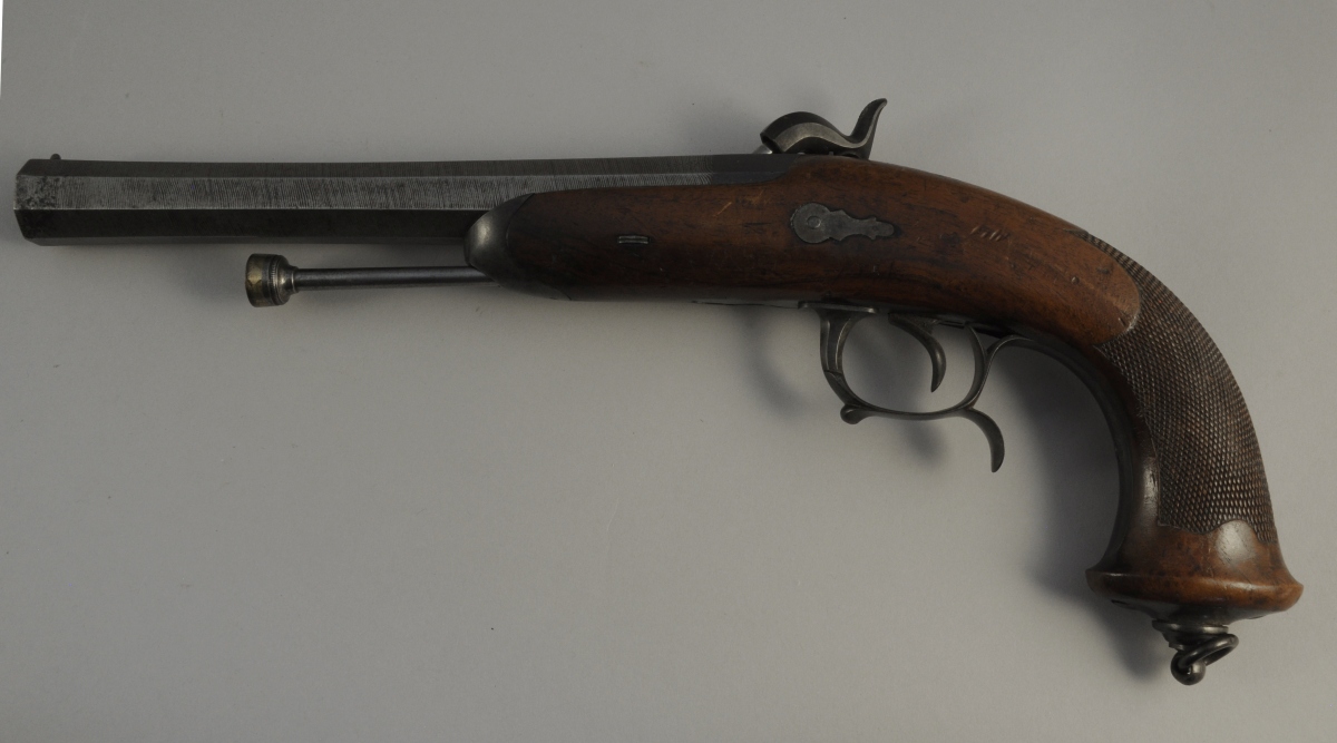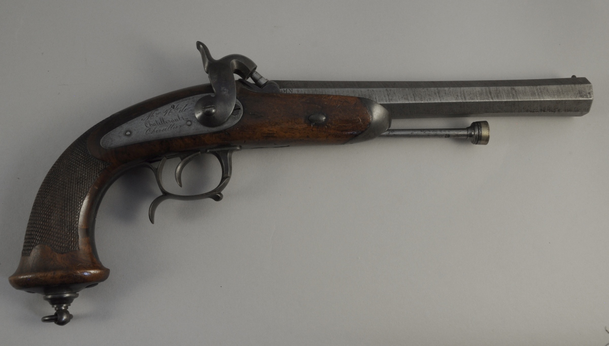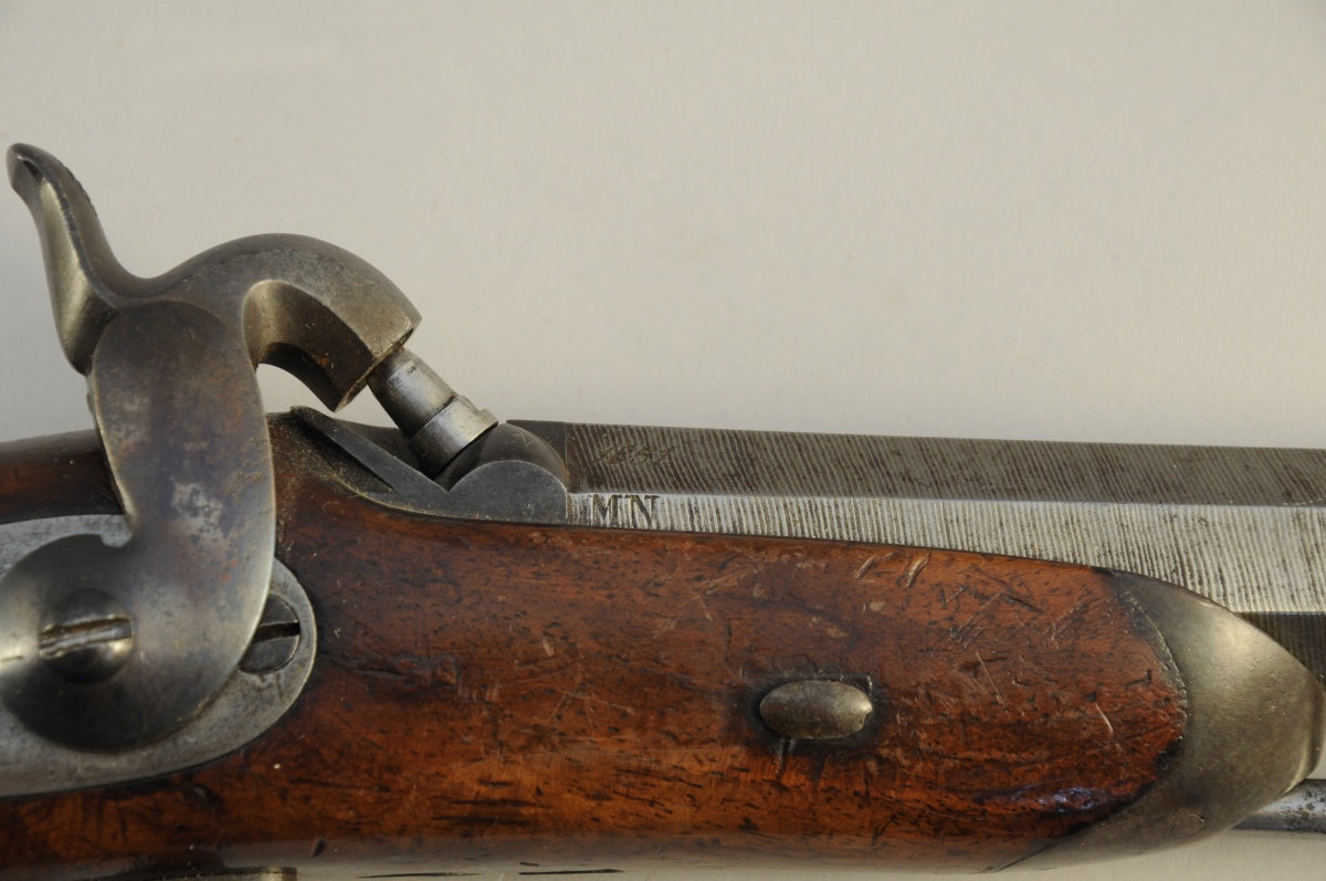 PISTOLET D'OFFICIER À PERCUSSION, modèle 1833. Canon en damas à pans légèrement tromblonné, daté 1851 et marqué "MN" au tonnerre. Crosse en noyer quadrillée. La platine gravée "Mre Rle de / Chatellerault / Chevallier". Calotte à anneau mobile, baguette en fer. La crosse poinçonnée G couronné et CA.