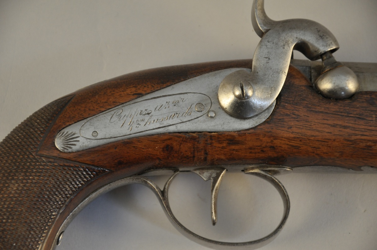 PISTOLET D'OFFICIER À PERCUSSION. Canon en damas à pans. Crosse en noyer quadrillée. Garnitures en fer. Calotte sculptée d'une frise feuillagée. Poinçon du banc d'épreuve de Liège. Platine signée "Cappez (?) Armr / 4em hussards".