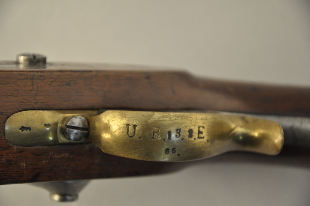 PRUSSE. PISTOLET DE CAVALERIE À PERCUSSION, MODÈLE 1851, canon rond à pans au tonnerre daté 1852.1866. Crosse en noyer poinçonnée. Garnitures en laiton poinçonnées, anneau de calotte en fer, le pontet matriculé : "U.R.13.2.E.86.". La platine signée "Potsdam" surmonté de la couronne impériale. Bel état.