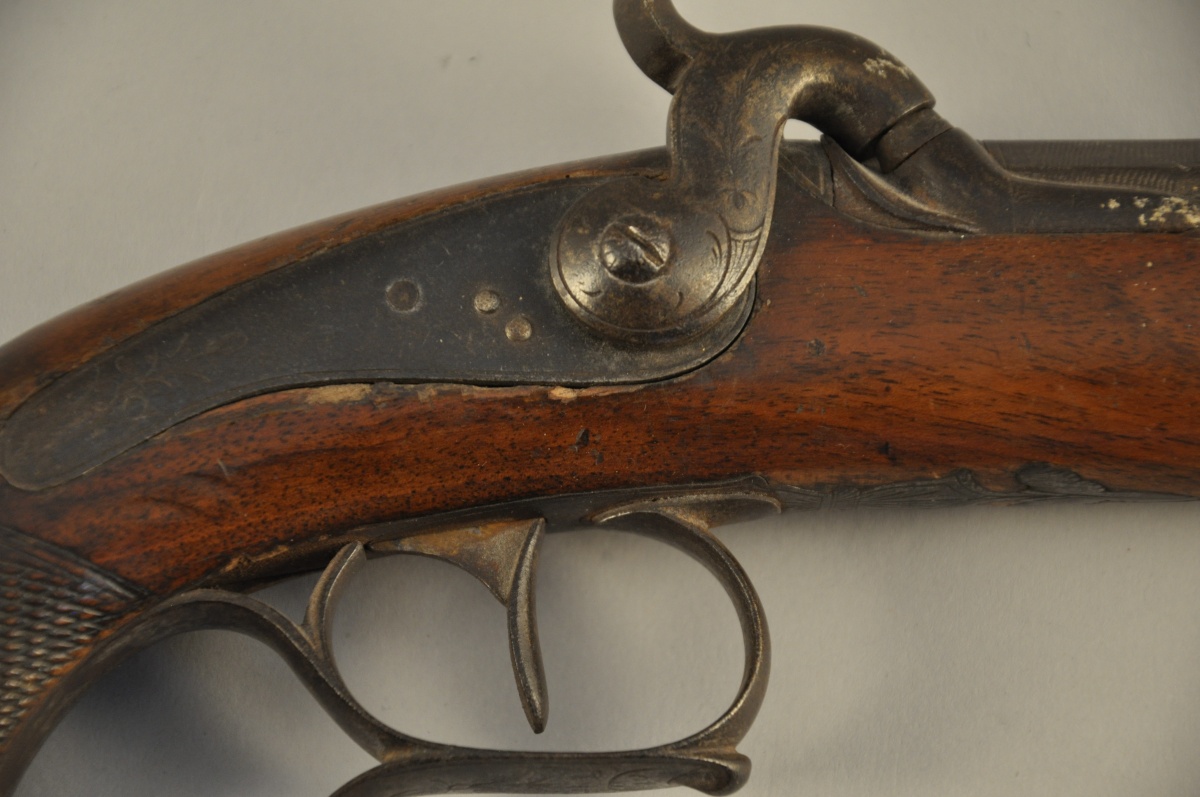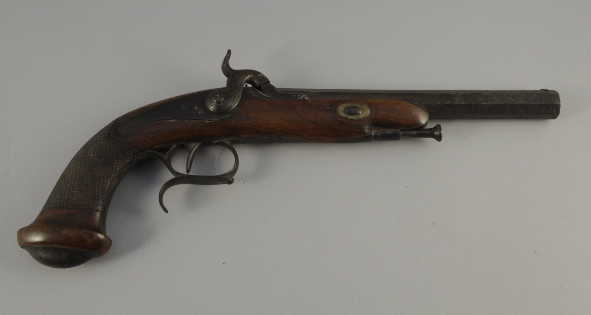 PISTOLET D'OFFICIER À PERCUSSION type 1833. Canon en damas à pans légèrement tromblonné. Crosse en noyer quadrillée.
