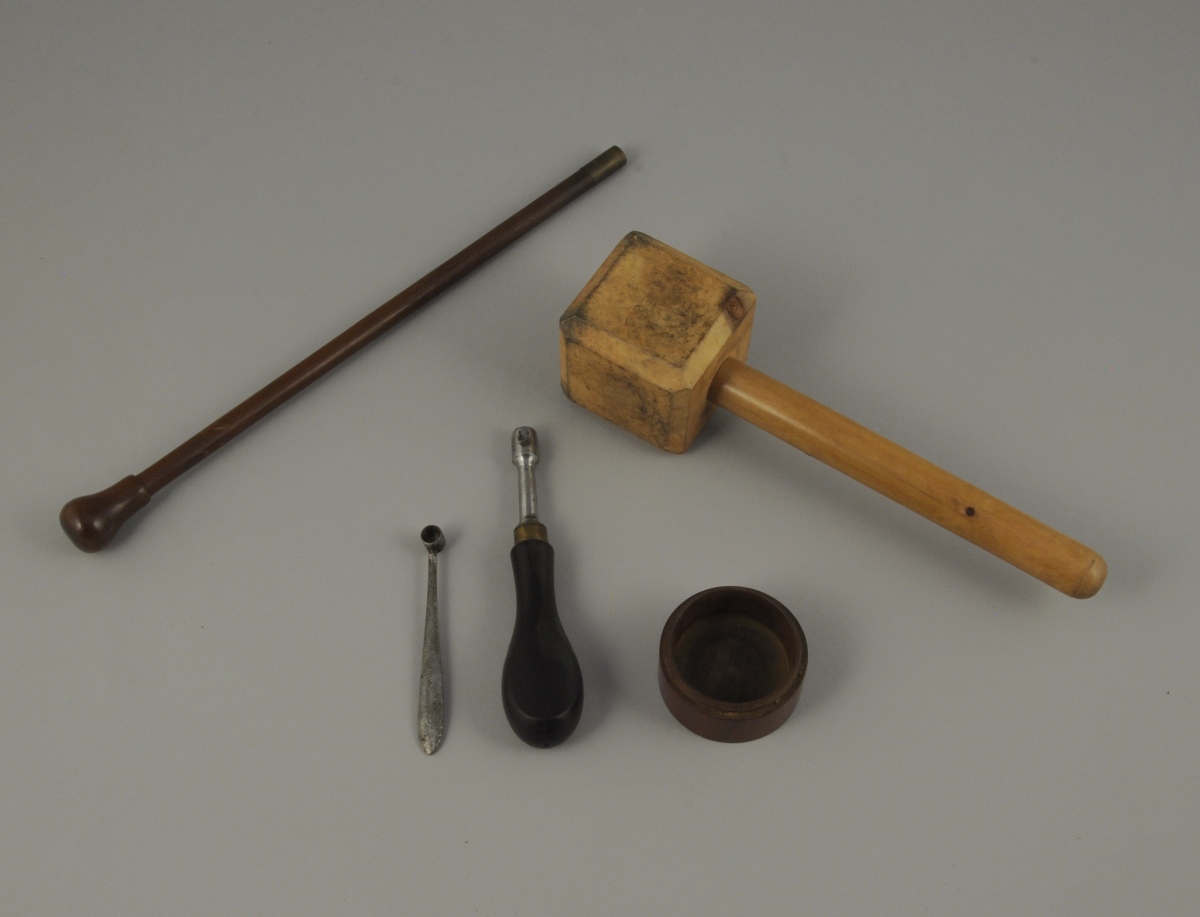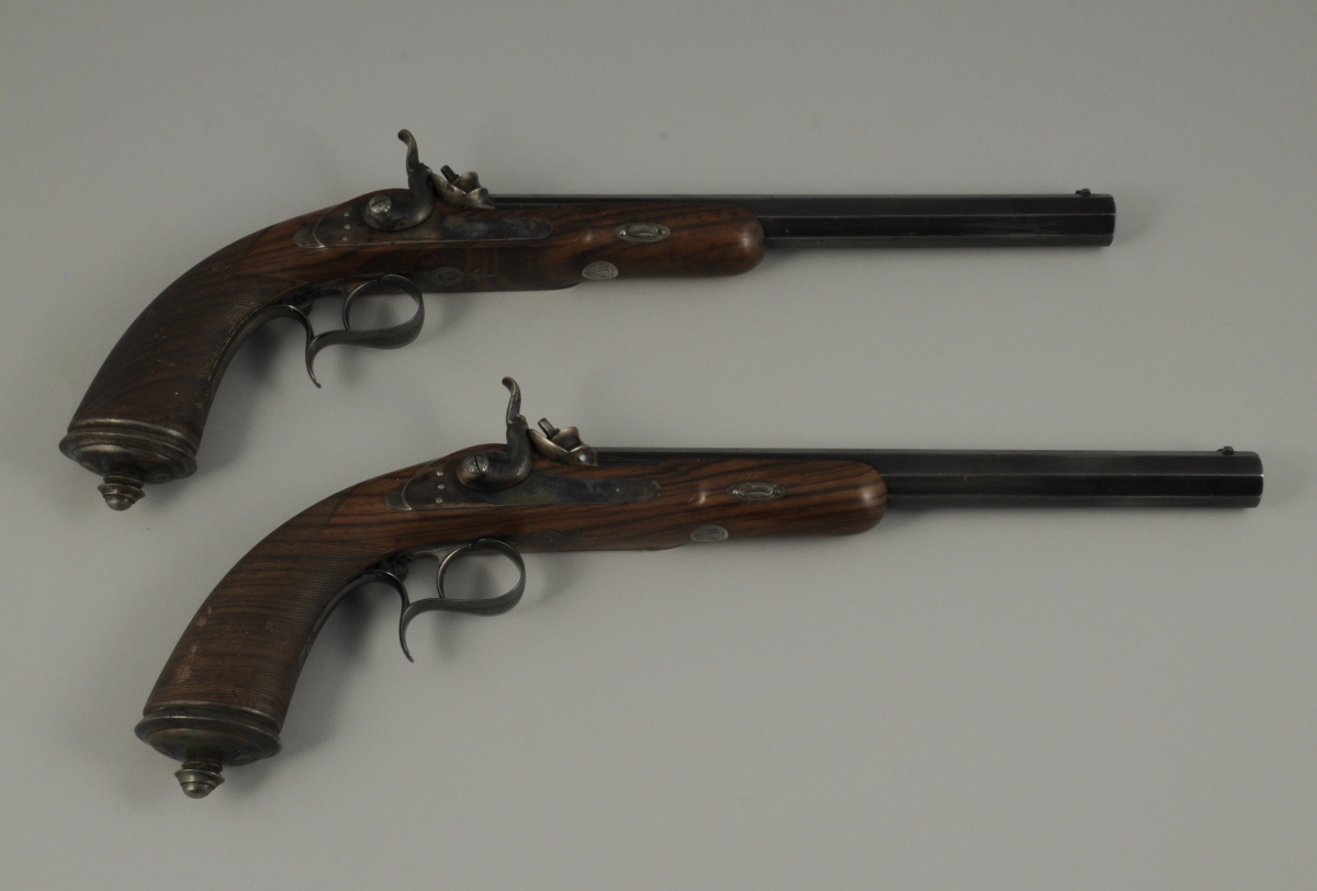 COFFRET-NÉCESSAIRE contenant une PAIRE DE PISTOLETS DE DUEL à percussion et leurs accessoires par Gastinne-Renette. Canons octogonaux bleuis signés 'Fni Gastinne- Renette à Paris" et numérotés 1 et 2 au tonnerre. Platines, chiens, pontets repose-doigt et calottes gravés de rinceaux feuillagés. Crosses en noyer quadrillées. Pastilles monogrammée "VF". Accessoires : baguette de nettoyage (manque), clef, dosette, maillet et boîte à capsules (manque le couvercle).