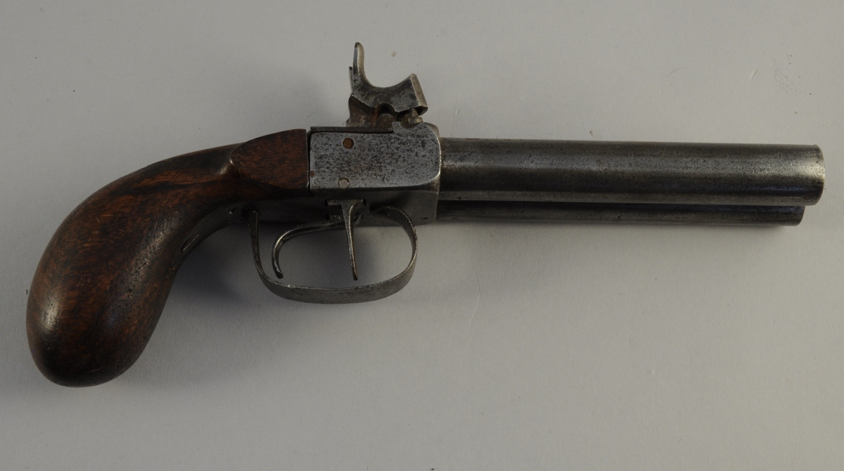 PISTOLET À COFFRE à percussion, deux coups. Canons ronds en table poinçonnés 4 et 8. Coffre uni et pontet en fer. Crosse en noyer.