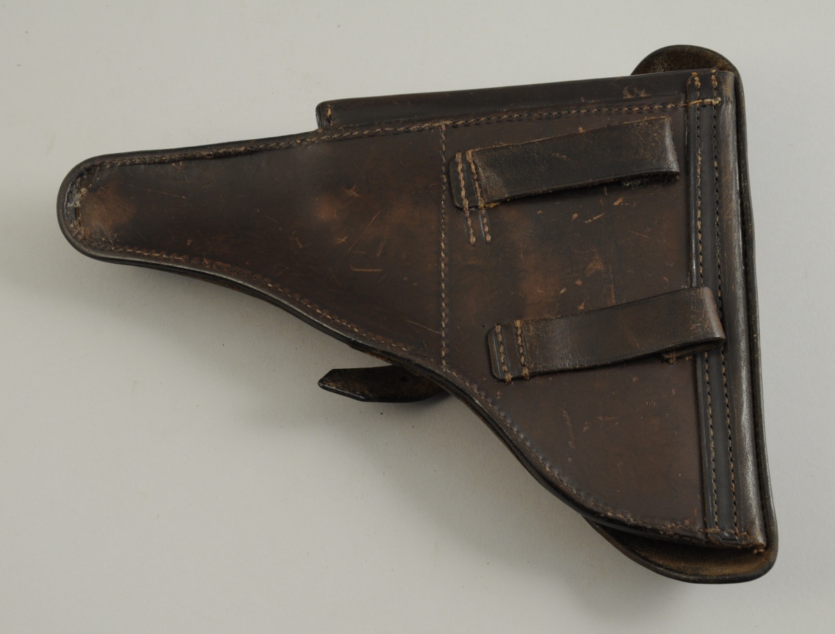 ÉTUI de LUGER P08 en cuir brun sombre marqué "REV". Avec sa clef numérotée 6233. La présence de trois petits trous indique qu'il portait probablement un insigne.