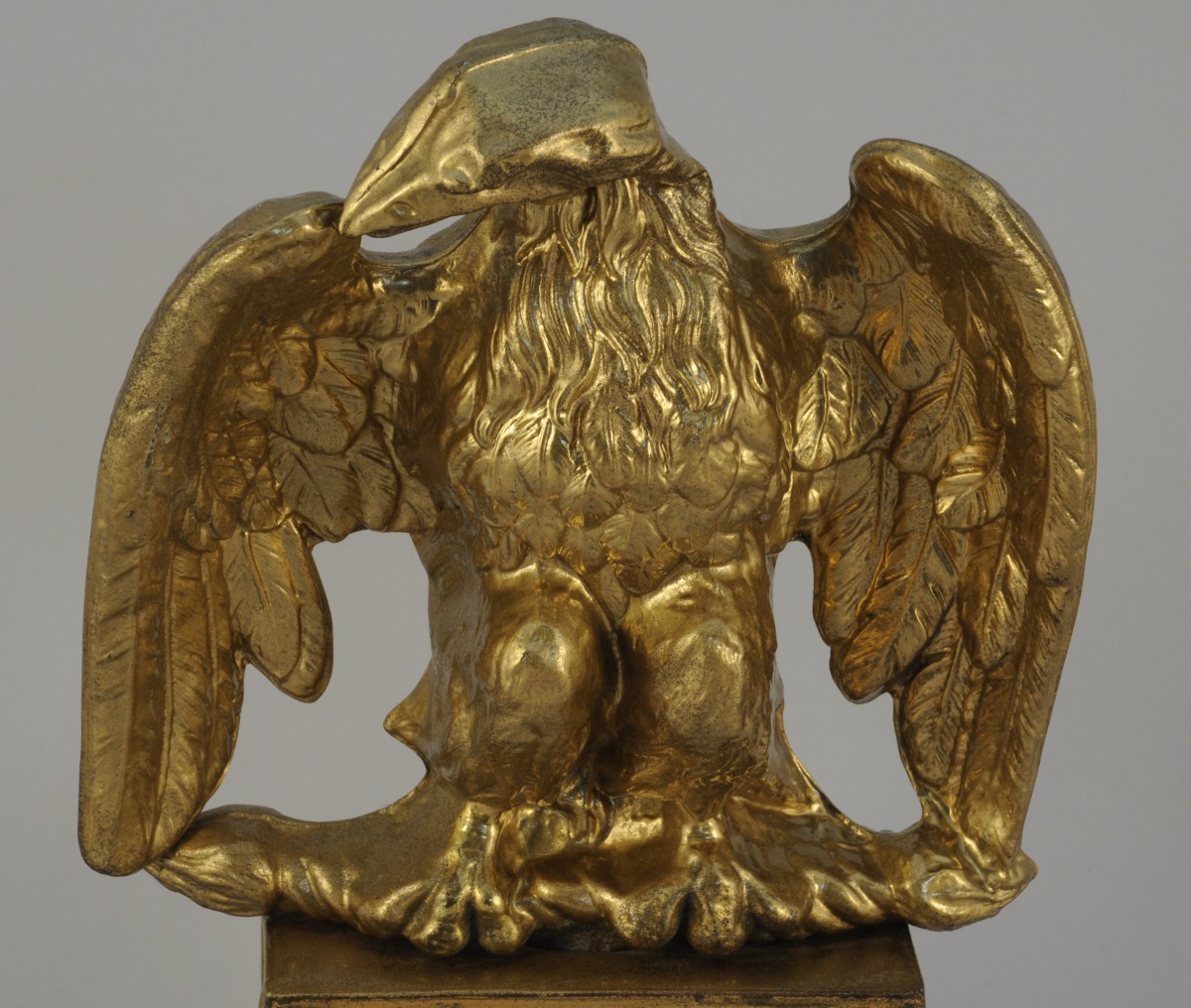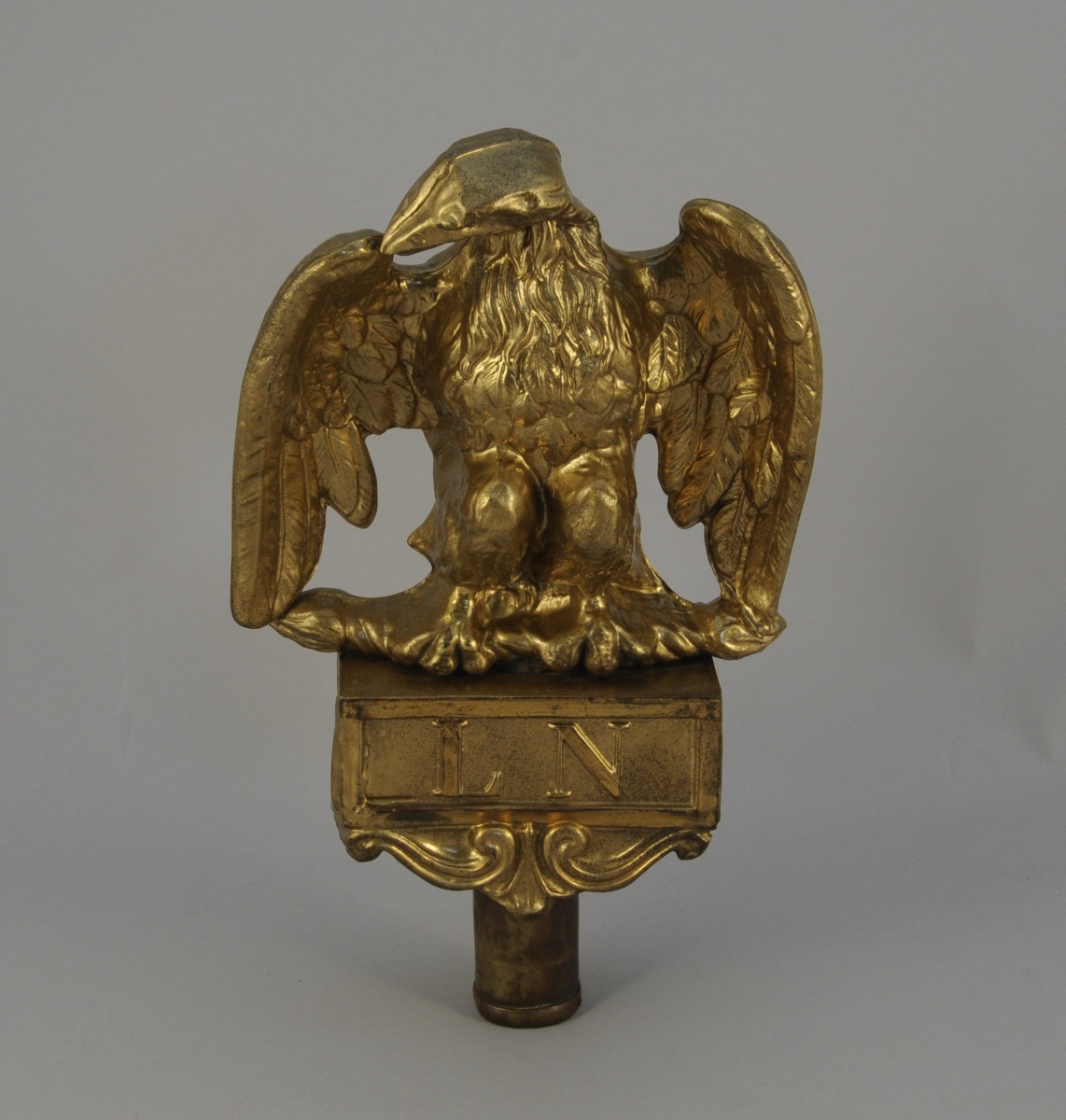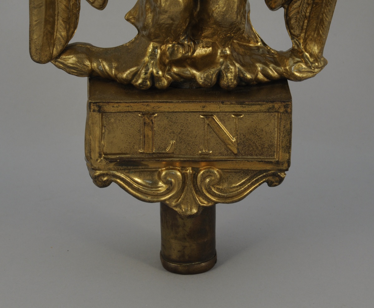 AIGLE DE DRAPEAU DE LA GARDE NATIONALE en tôle emboutie et dorée, modèle 1852, présidence de Louis-Napoléon Bonaparte. Elle présente son profil gauche, les ailes mi-déployées aux extrémités pointées vers le bas. Elle tient dans ses serres le fuseau de Jupiter et repose sur un caisson portant les initiales "LN" souligné de volutes et fleurons. L'ensemble monté sur une douille circulaire.