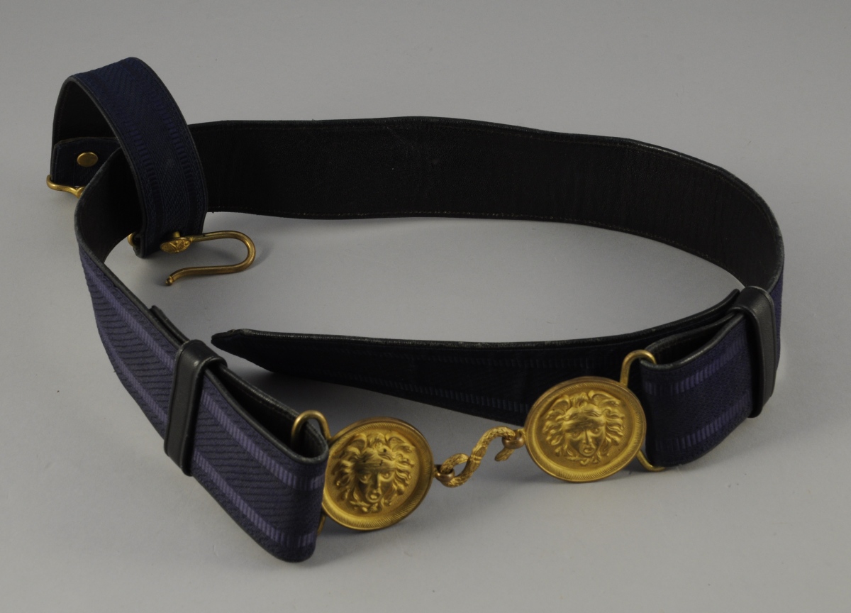 CEINTURON PORTE-ÉPÉE en passementerie bleue doublée de maroquin bleu. Boucle-agrafe en laiton doré à tête de Méduse.